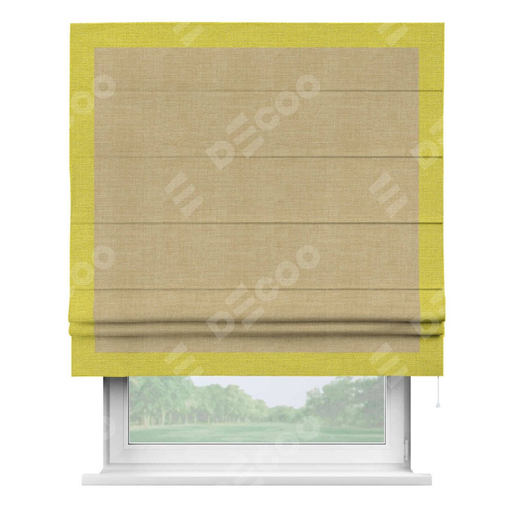 Римская штора производителя «Cortin», используется для проёма, пошита из ткани лён бежевый, артикул 7442. Отделка шторы кантом «Чесс», ткань для канта используется из льна разной расцветки на выбор. Имеет универсальный механизм и подходит для монтажа: на потолок, на стену и в нишу.