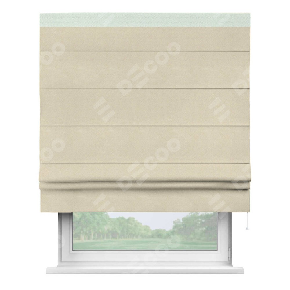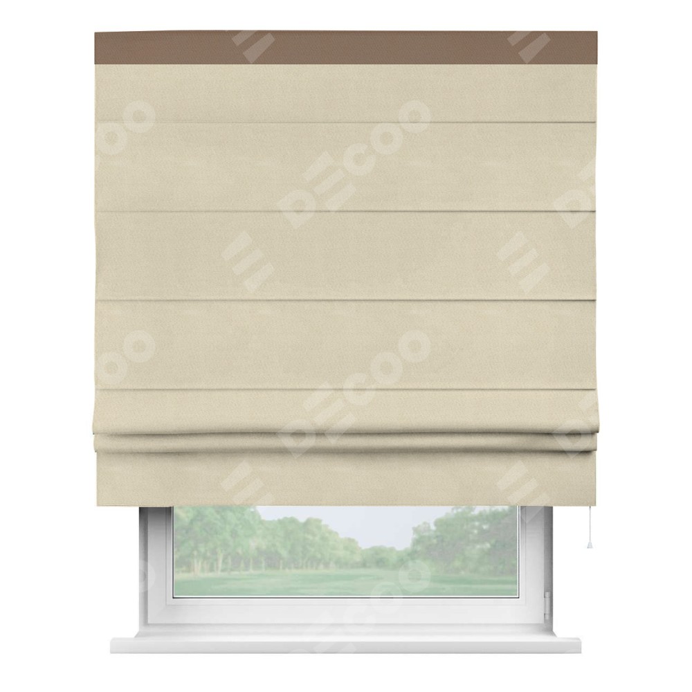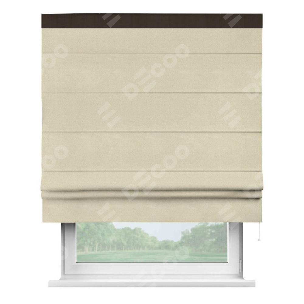 Римская штора производителя «Cortin», используется для проёма, пошита из ткани блэкаут однотонный бежевый, артикул ткани 13125. Отделка шторы кантом «Кинг», ткань для канта используется из блэкаута однотонного разной расцветки на выбор. Имеет универсальный механизм и подходит для монтажа: на потолок, на стену и в нишу.