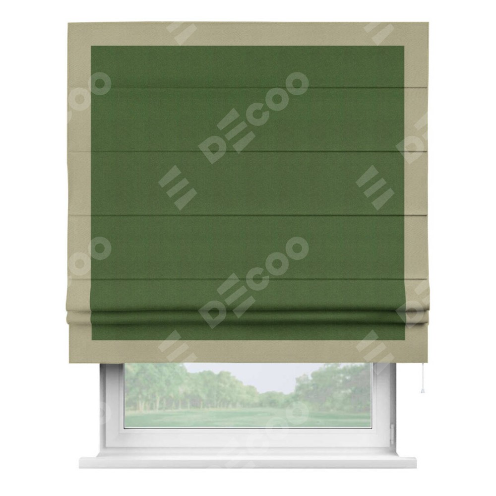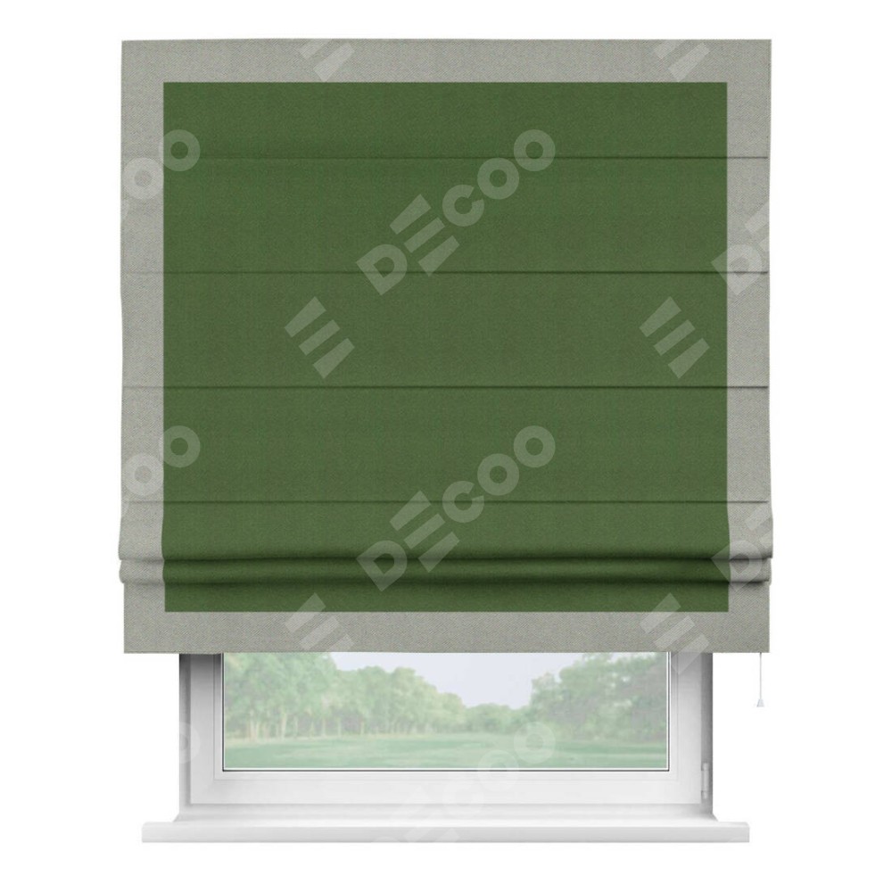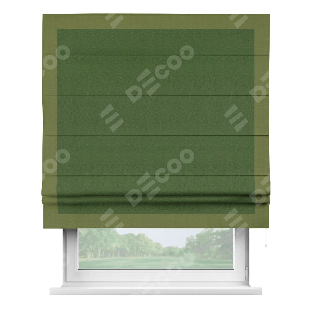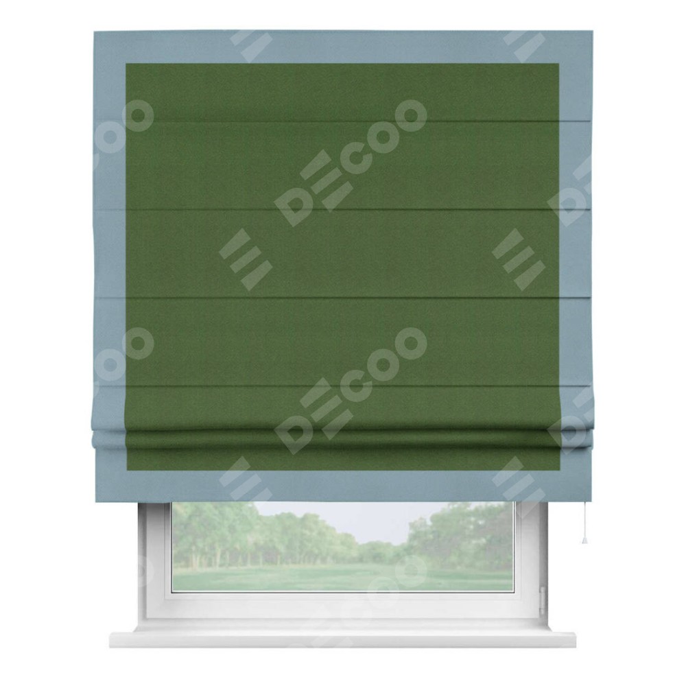 Римская штора производителя «Cortin», используется для проёма, пошита из ткани блэкаут однотонный зелёный перламутр, артикул ткани 81859−2. Отделка шторы кантом «Чесс», ткань для канта используется из блэкаута однотонного разной расцветки на выбор. Имеет универсальный механизм и подходит для монтажа: на потолок, на стену и в нишу.