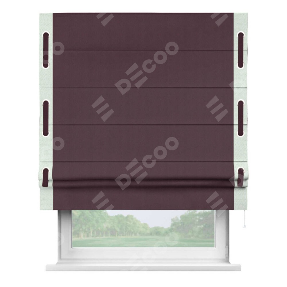 Римская штора производителя «Cortin», используется для проёма, пошита из ткани блэкаут однотонный сиреневый, артикул ткани 29333−2. Отделка шторы кантом «Стрим Дуо» на кантах расположены люверсы с пояском, ткань для канта используется из блэкаута однотонного разной расцветки на выбор. Ткань для пояска обычно используется из основной ткани шторы, а так же можно сделать из любой расцветки по желанию. Имеет универсальный механизм и подходит для монтажа: на потолок, на стену и в нишу.