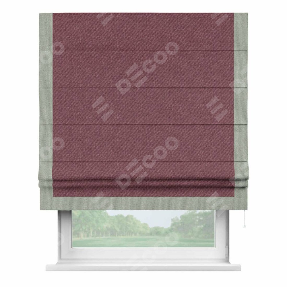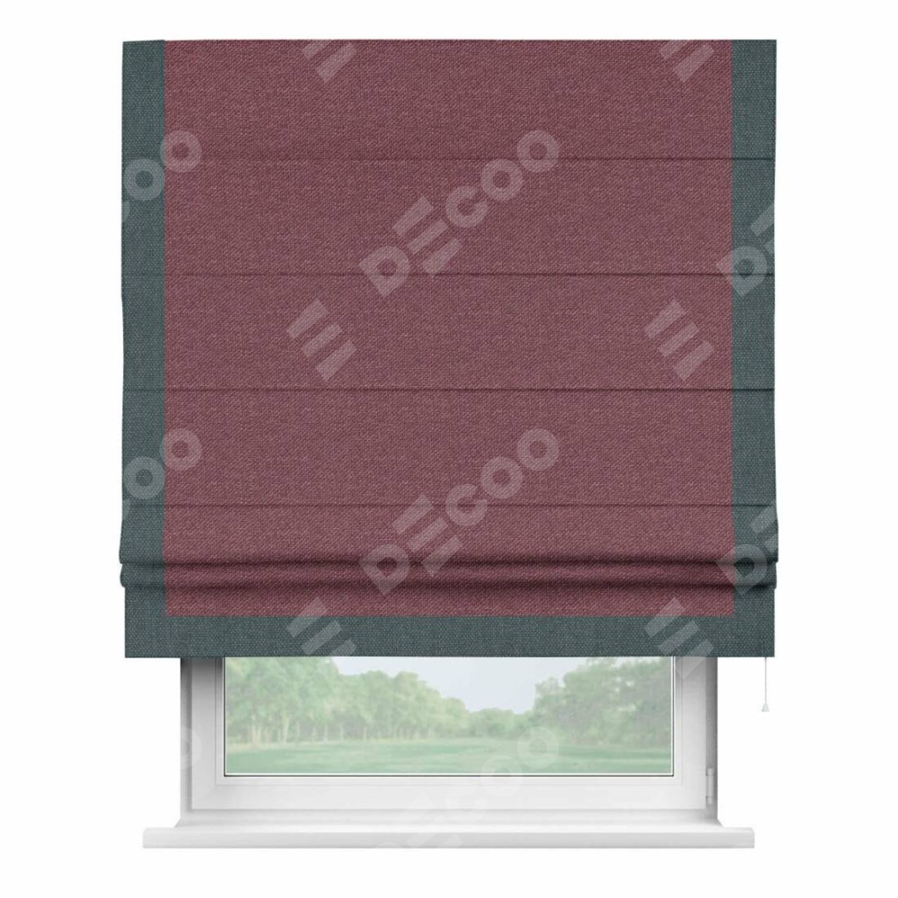 Римская штора производителя «Cortin», используется для проёма, пошита из ткани лён димаут марсала, артикул 1602. Отделка шторы кантом «Виктория», ткань для канта используется из льна димаут разной расцветки на выбор. Имеет универсальный механизм и подходит для монтажа: на потолок, на стену и в нишу.