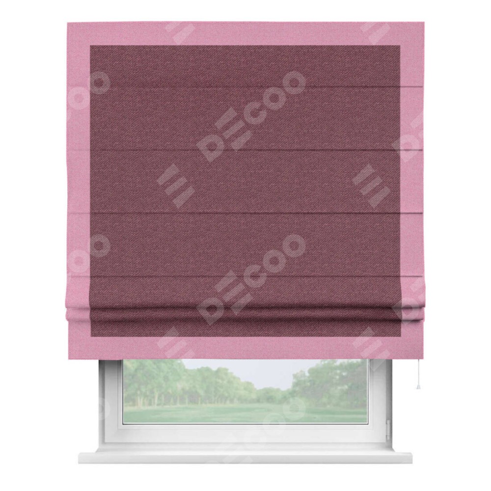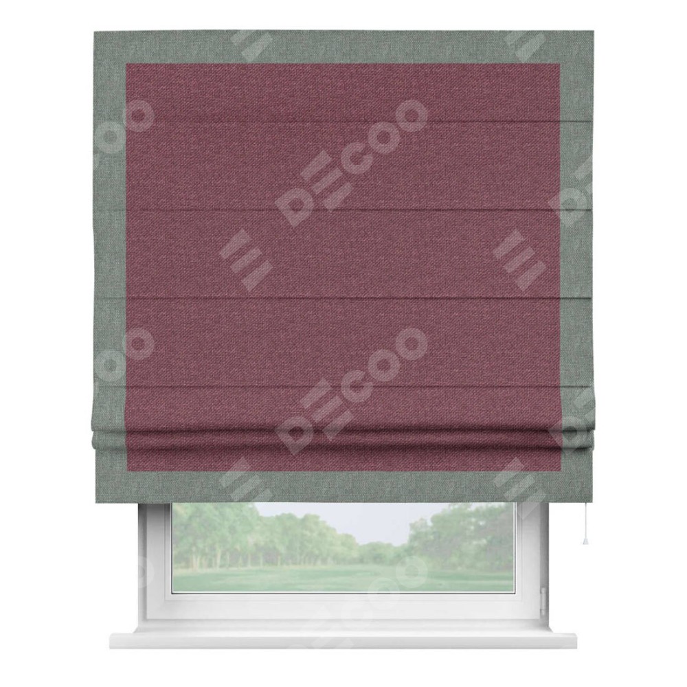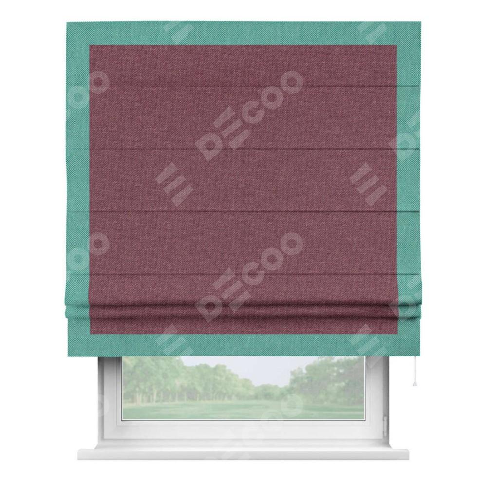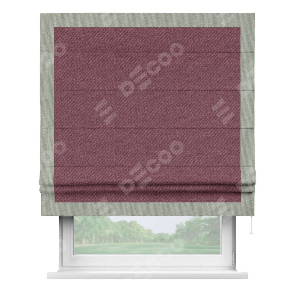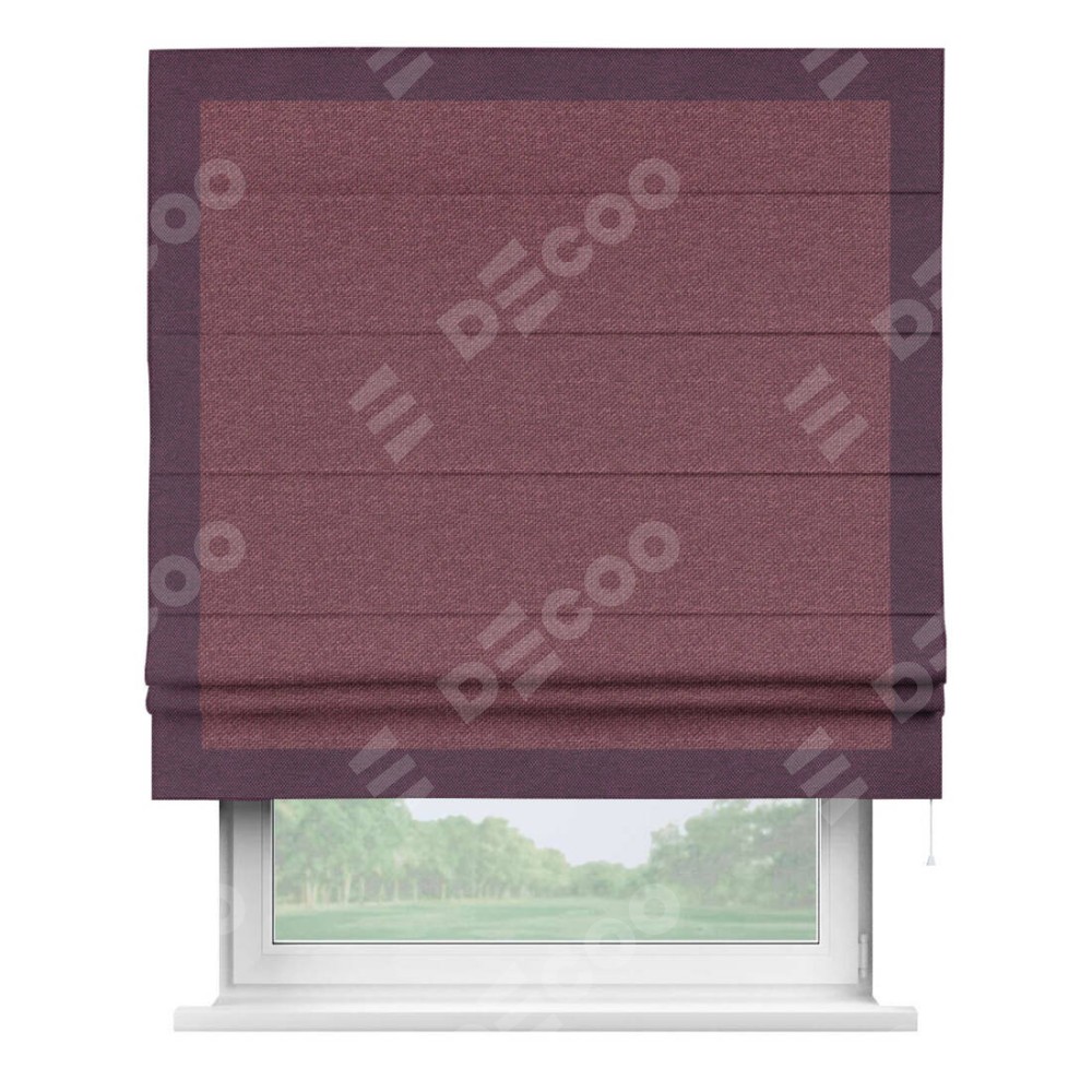Римская штора производителя «Cortin», используется для проёма, пошита из ткани лён димаут марсала, артикул 1602. Отделка шторы кантом «Чесс», ткань для канта используется из льна димаут разной расцветки на выбор. Имеет универсальный механизм и подходит для монтажа: на потолок, на стену и в нишу.
