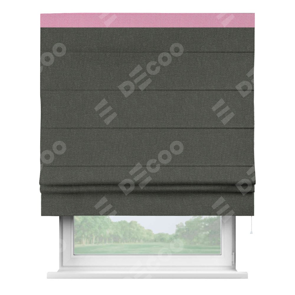 Римская штора производителя «Cortin», используется для проёма, пошита из ткани лён димаут графитово-серый, артикул 35129. Отделка шторы кантом «Кинг», ткань для канта используется из льна димаут разной расцветки на выбор. Имеет универсальный механизм и подходит для монтажа: на потолок, на стену и в нишу.