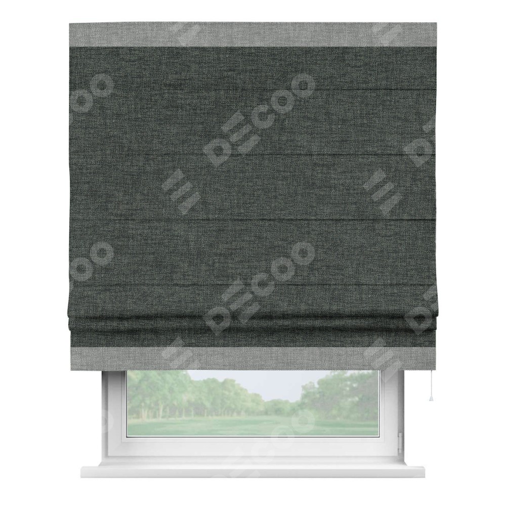 Римская штора производителя «Cortin», используется для проёма, пошита из ткани рогожка димаут графит, артикул 102−34. Отделка шторы кантом «Горизонт», ткань для канта используется из рогожки димаут разной расцветки на выбор. Имеет универсальный механизм и подходит для монтажа: на потолок, на стену и в нишу.