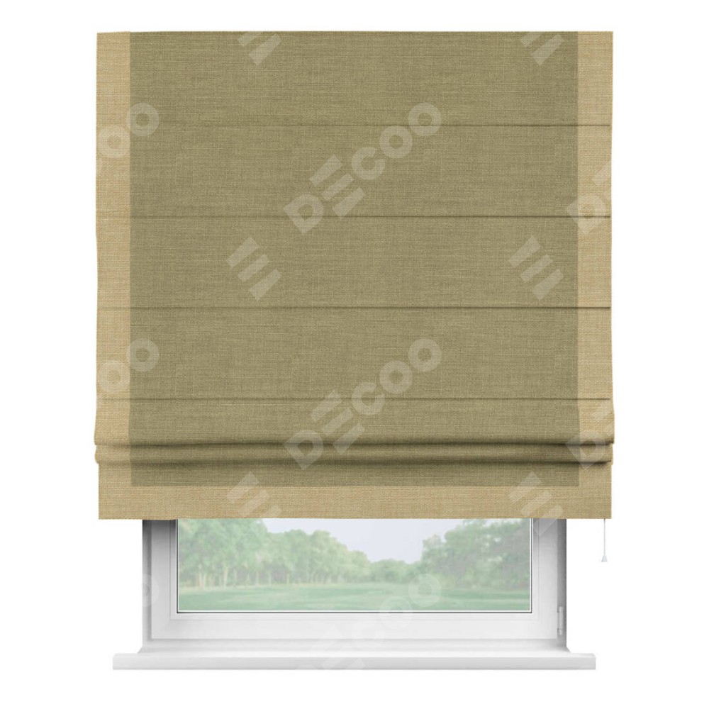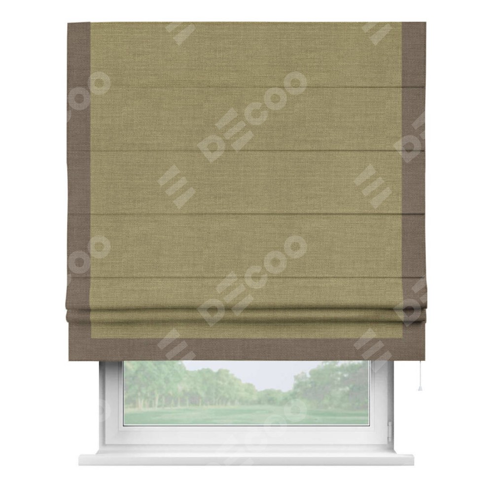 Римская штора производителя «Cortin», используется для проёма, пошита из ткани лён коричневый, артикул 7443. Отделка шторы кантом «Виктория», ткань для канта используется из льна разной расцветки на выбор. Имеет универсальный механизм и подходит для монтажа: на потолок, на стену и в нишу.