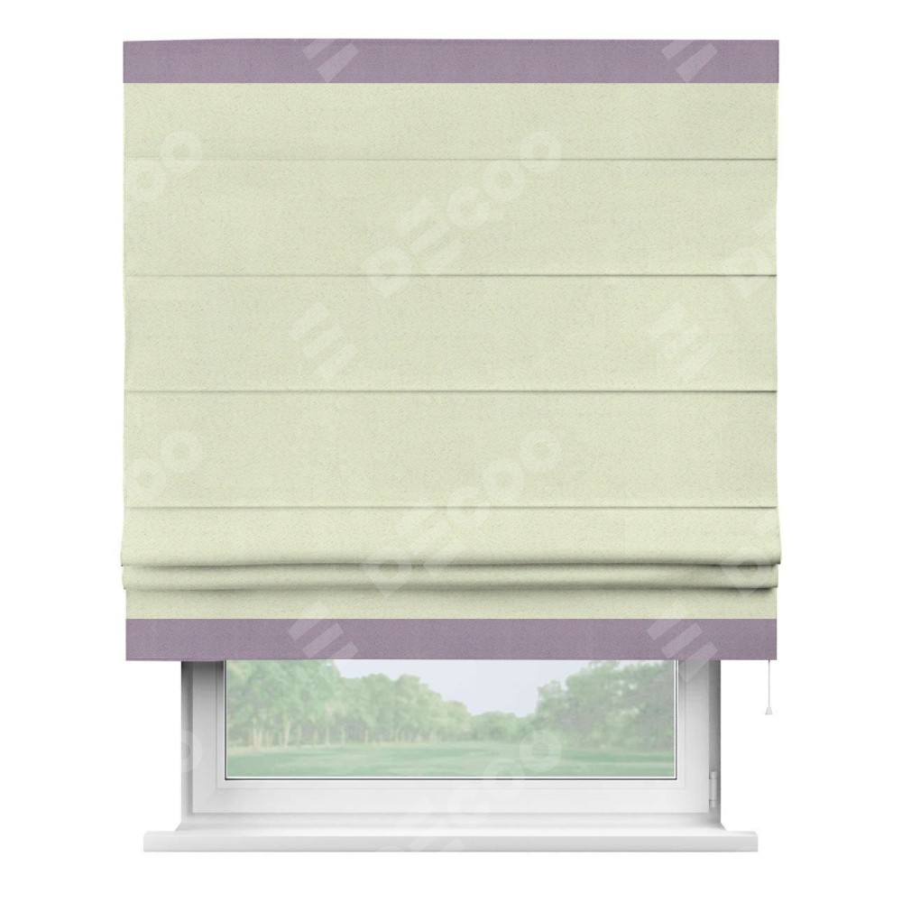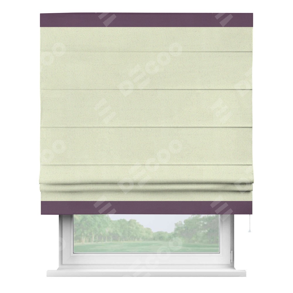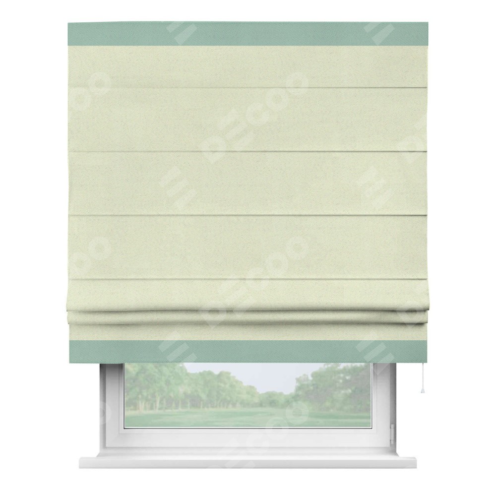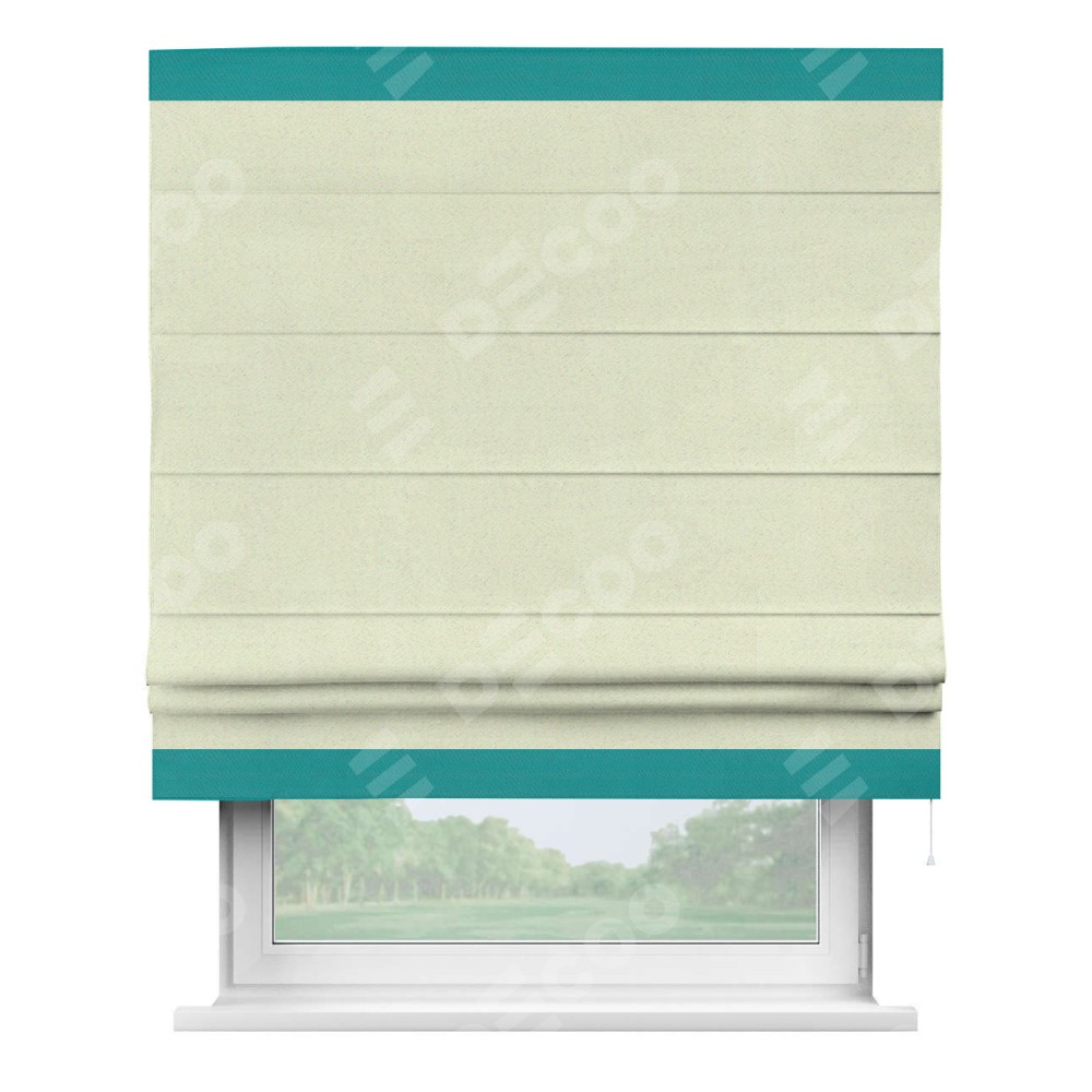 Римская штора производителя «Cortin», используется для проёма, пошита из ткани блэкаут однотонный сливочный, артикул ткани 6668−02. Отделка шторы кантом «Горизонт», ткань для канта используется из блэкаута однотонного разной расцветки на выбор. Имеет универсальный механизм и подходит для монтажа: на потолок, на стену и в нишу.