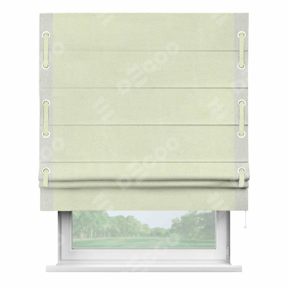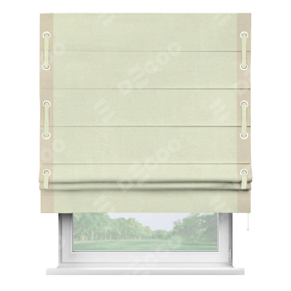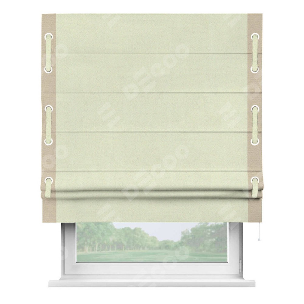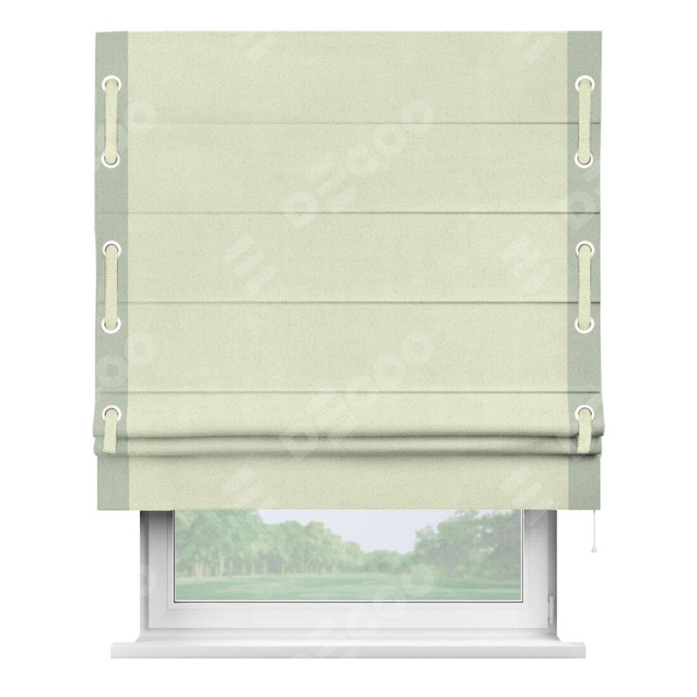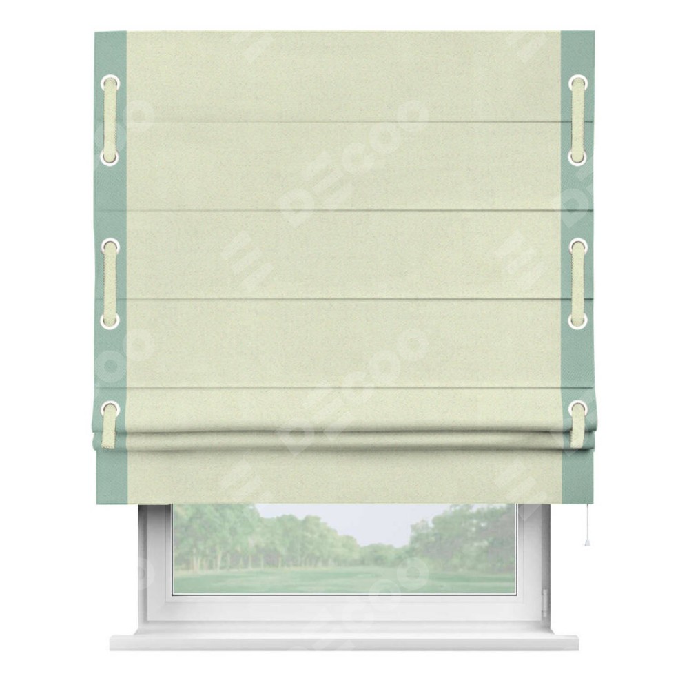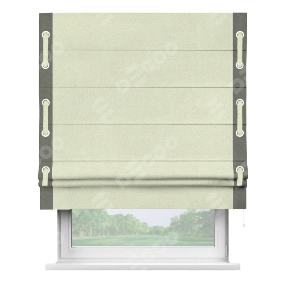 Римская штора производителя «Cortin», используется для проёма, пошита из ткани блэкаут однотонный сливочный, артикул ткани 6668−02. Отделка шторы кантом «Стрим Дуо» на кантах расположены люверсы с пояском, ткань для канта используется из блэкаута однотонного разной расцветки на выбор. Ткань для пояска обычно используется из основной ткани шторы, а так же можно сделать из любой расцветки по желанию. Имеет универсальный механизм и подходит для монтажа: на потолок, на стену и в нишу.