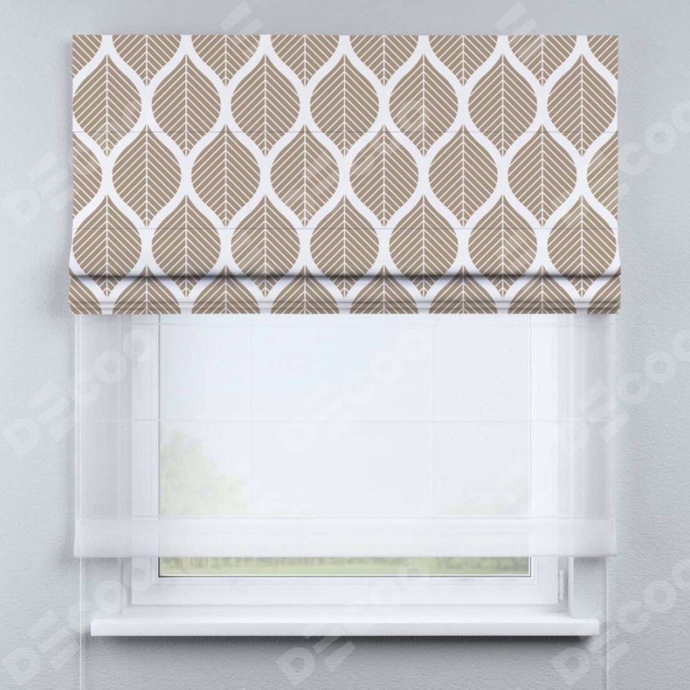 Римская штора день-ночь производителя «Cortin», используется для проёма, пошита из двух полотен, с лицевой блэкаут с нанесением сублимационной печати «Листья геометрия», вторая ткань тюль (по стандарту комплектуется тюль белого цвета артикул V-01). Имеет универсальный механизм и подходит для монтажа: на потолок, на стену и в нишу.