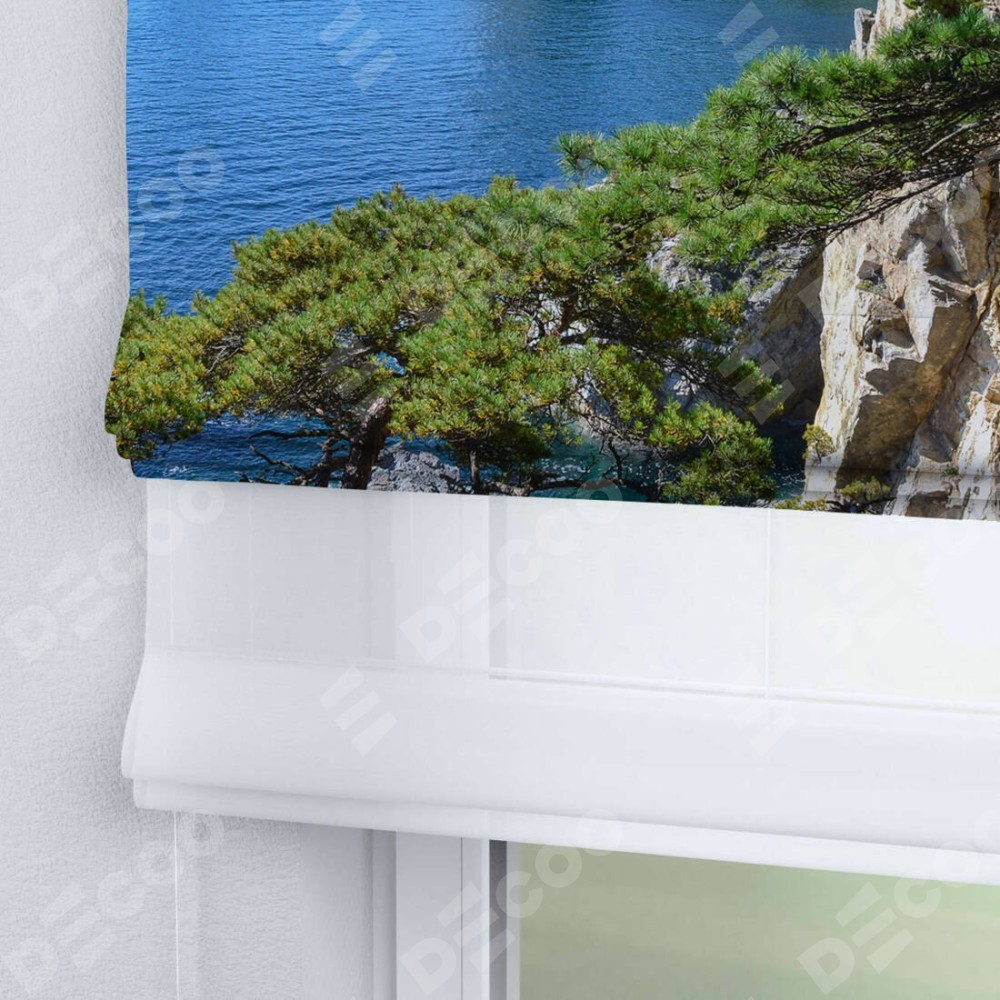 Римская штора «Кортин» день-ночь «Море и сосны» отлично подойдёт для интерьера: в кухню, на балкон и в гостиную.