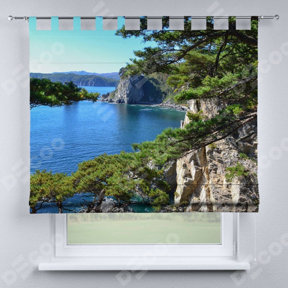 Римская штора производителя «Cortin», используется для проёма, пошита из ткани блэкаут с нанесением сублимационной печати «Море и сосны». Данная модель пошита на петлях, комплектуется на выбор круглым карнизом и подходит для монтажа на стену. Римская штора на петлях имеет простую систему регулировки высоты, отличительным преимуществом данной модели является простой способ монтажа. Достаточно повесить ее на трубу и штора готова!