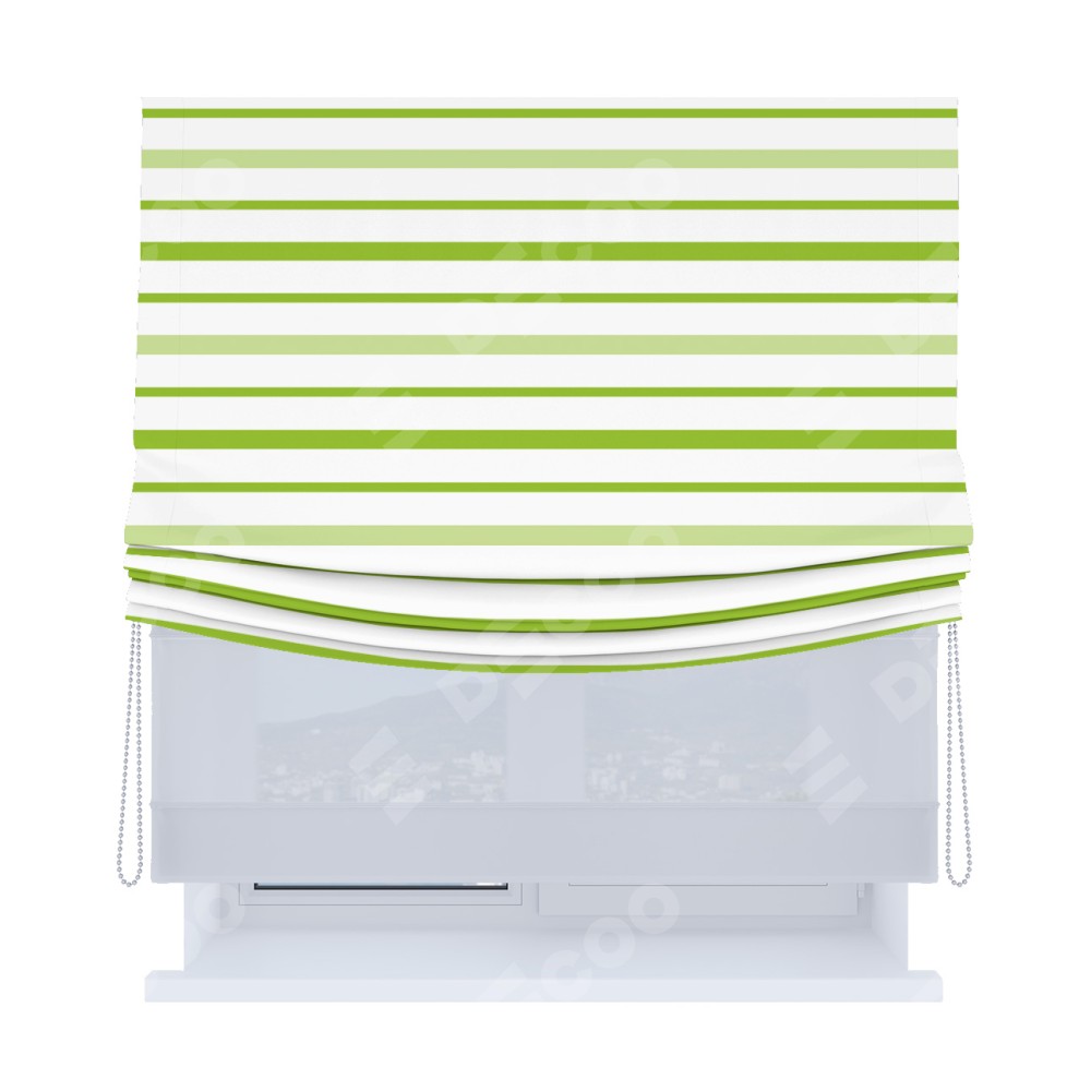 Римская штора день-ночь производителя «Cortin», используется для проёма, пошита из двух полотен, с лицевой блэкаут с нанесением сублимационной печати «Зелёные горизонтальные полоски», вторая ткань тюль (по стандарту комплектуется тюль белого цвета артикул V-01). Имеет универсальный механизм и подходит для монтажа: на потолок, на стену и в нишу. Удобное управление каждой шторой отдельно.