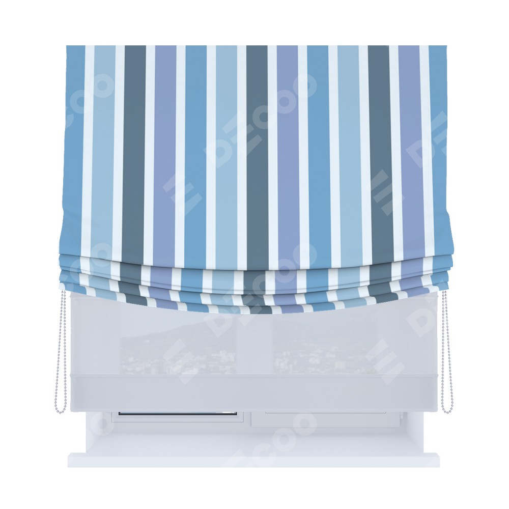Римская штора «Кортин», день-ночь с мягкими складками, «Сине-голубые вертикальные полоски» представлена к заказу по по вашим размерам. Её артикул: 25312. Цена будет зависеть от размерных характеристик и будет начинаться от 5 300 руб. В интернет-магазине Decoo есть возможность выбрать товар в любых размерных вариациях.
