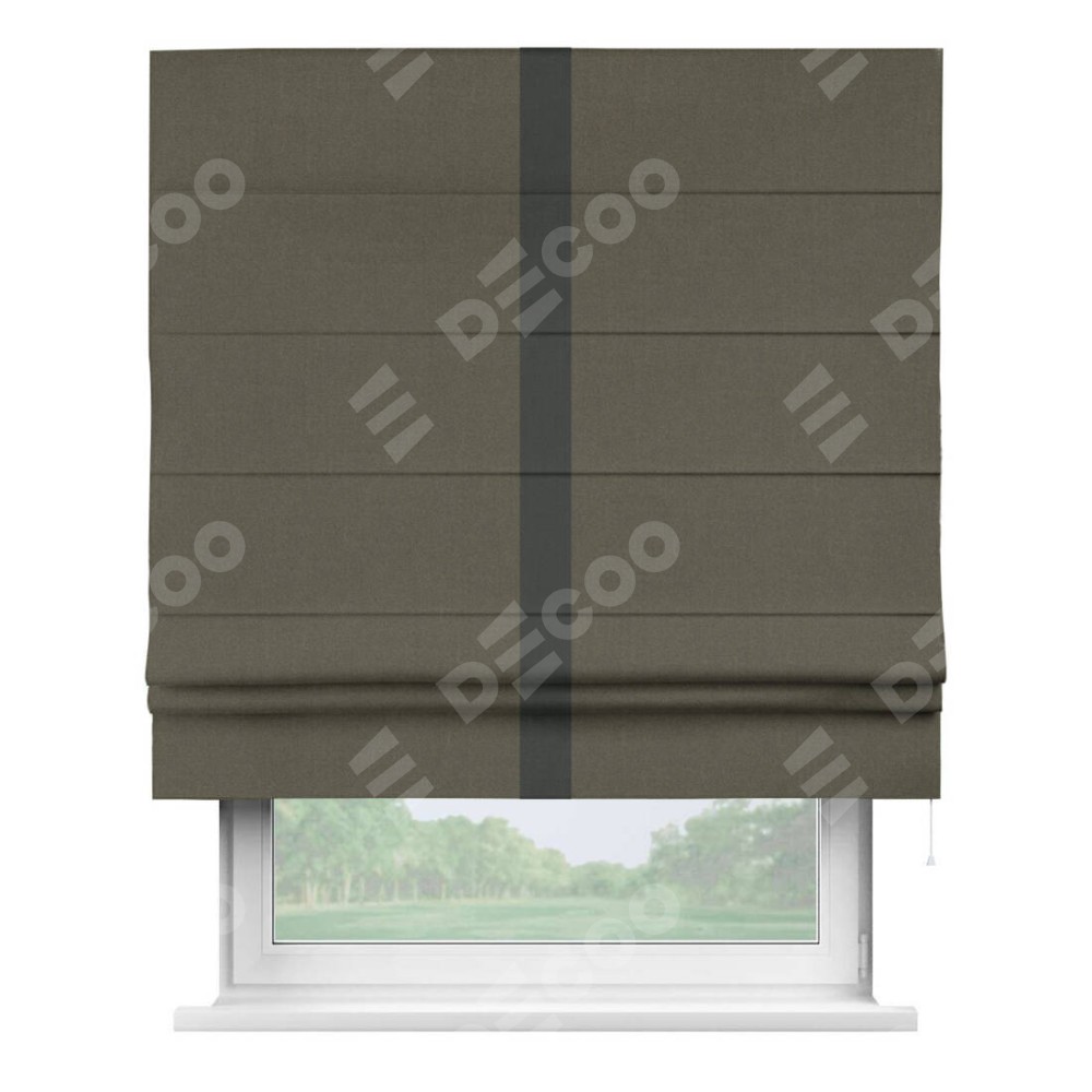 Римская штора производителя «Cortin», используется для проёма, пошита из ткани лён блэкаут коричневый, артикул 69383. Отделка шторы кантом «Хайвэй», ткань для канта используется из льна разной расцветки на выбор. Имеет универсальный механизм и подходит для монтажа: на потолок, на стену и в нишу.