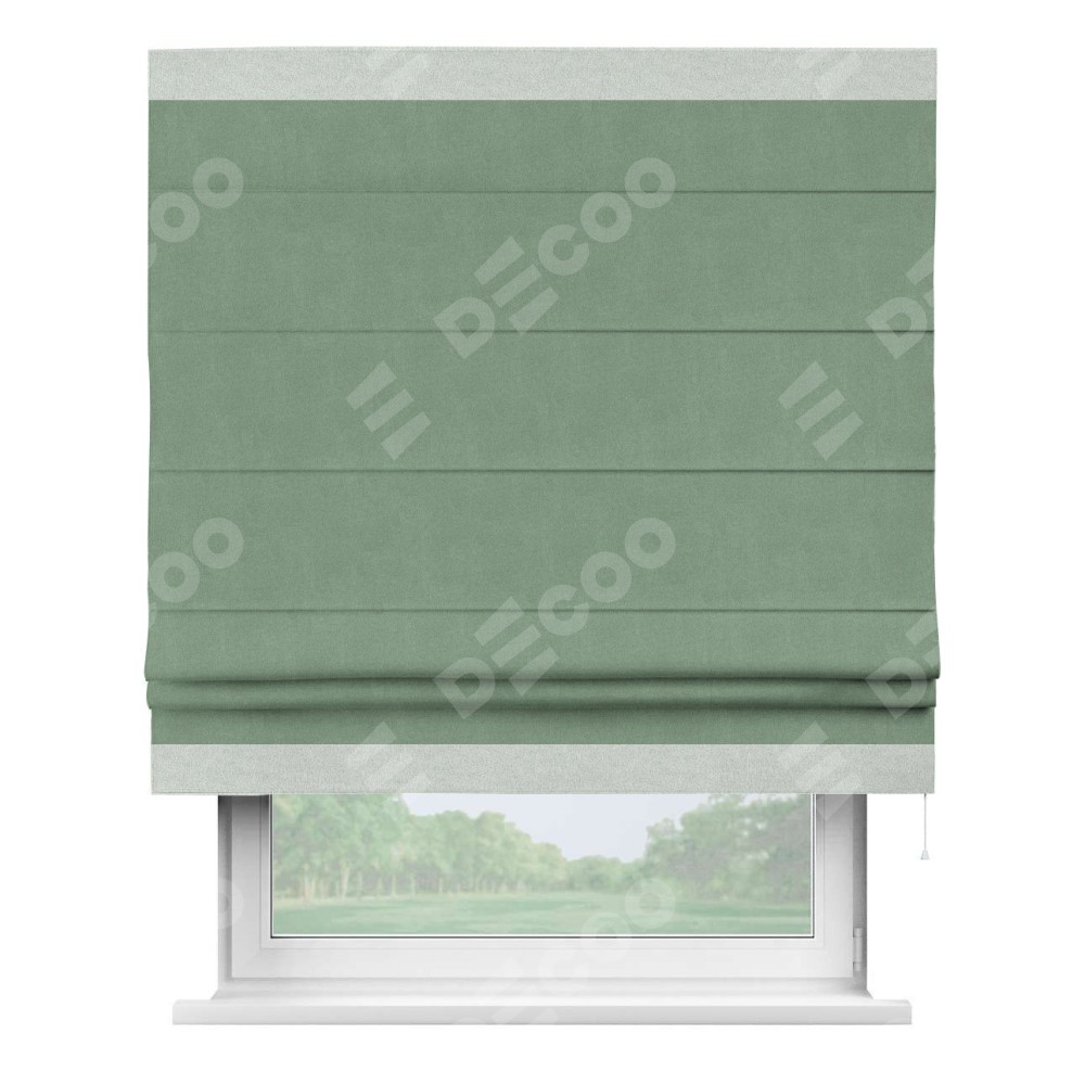 Римская штора производителя «Cortin», используется для проёма, пошита из ткани лён блэкаут светло-бирюзовый, артикул 69443. Отделка шторы кантом «Горизонт», ткань для канта используется из льна разной расцветки на выбор. Имеет универсальный механизм и подходит для монтажа: на потолок, на стену и в нишу.