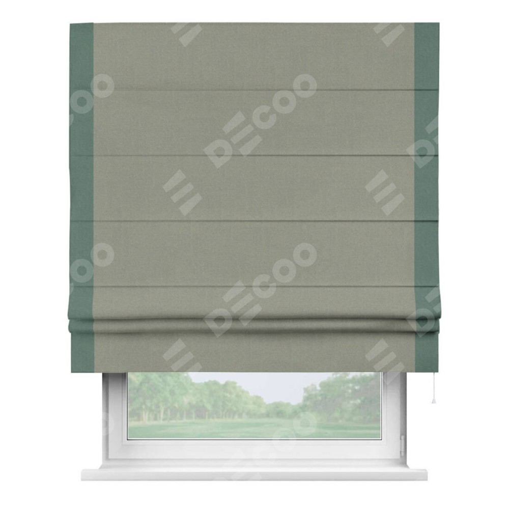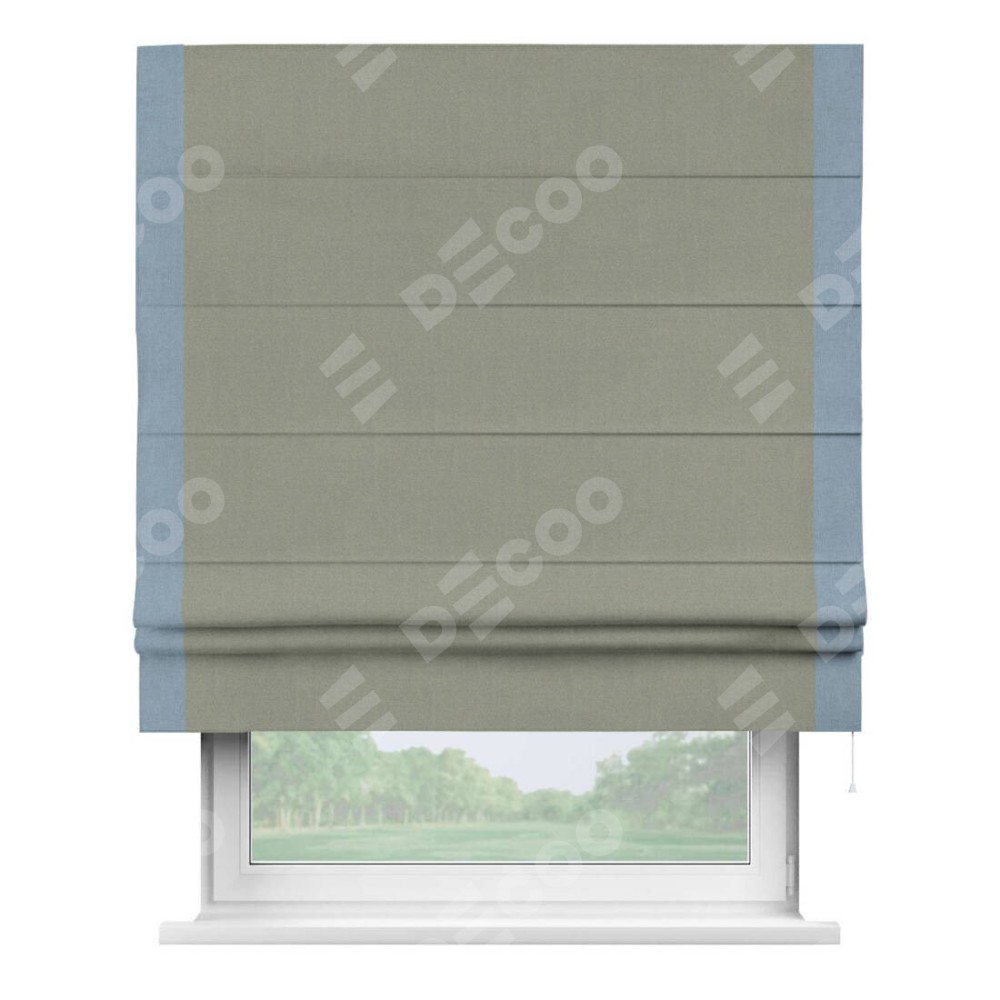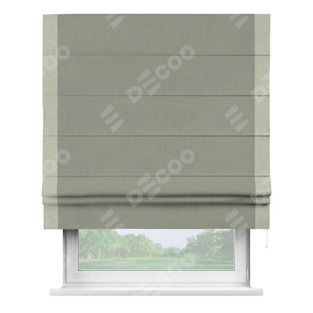 Римская штора производителя «Cortin», используется для проёма, пошита из ткани лён блэкаут светло-серый, артикул 69446. Отделка шторы кантом «Стрим Дуо», ткань для канта используется из льна разной расцветки на выбор. Имеет универсальный механизм и подходит для монтажа: на потолок, на стену и в нишу.