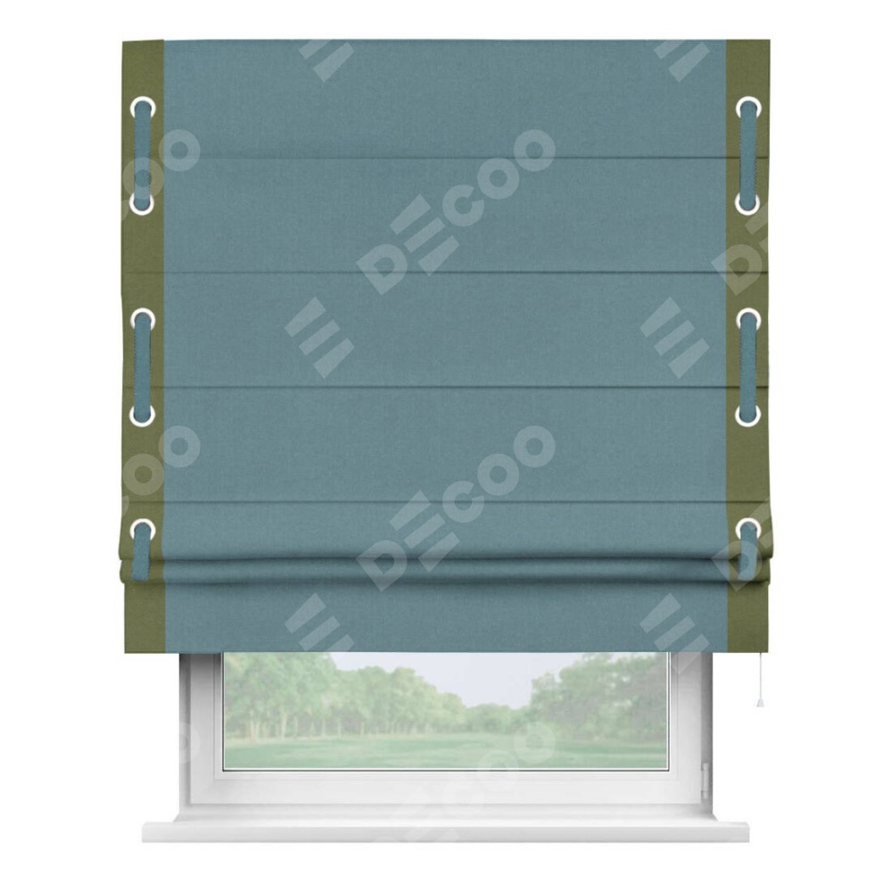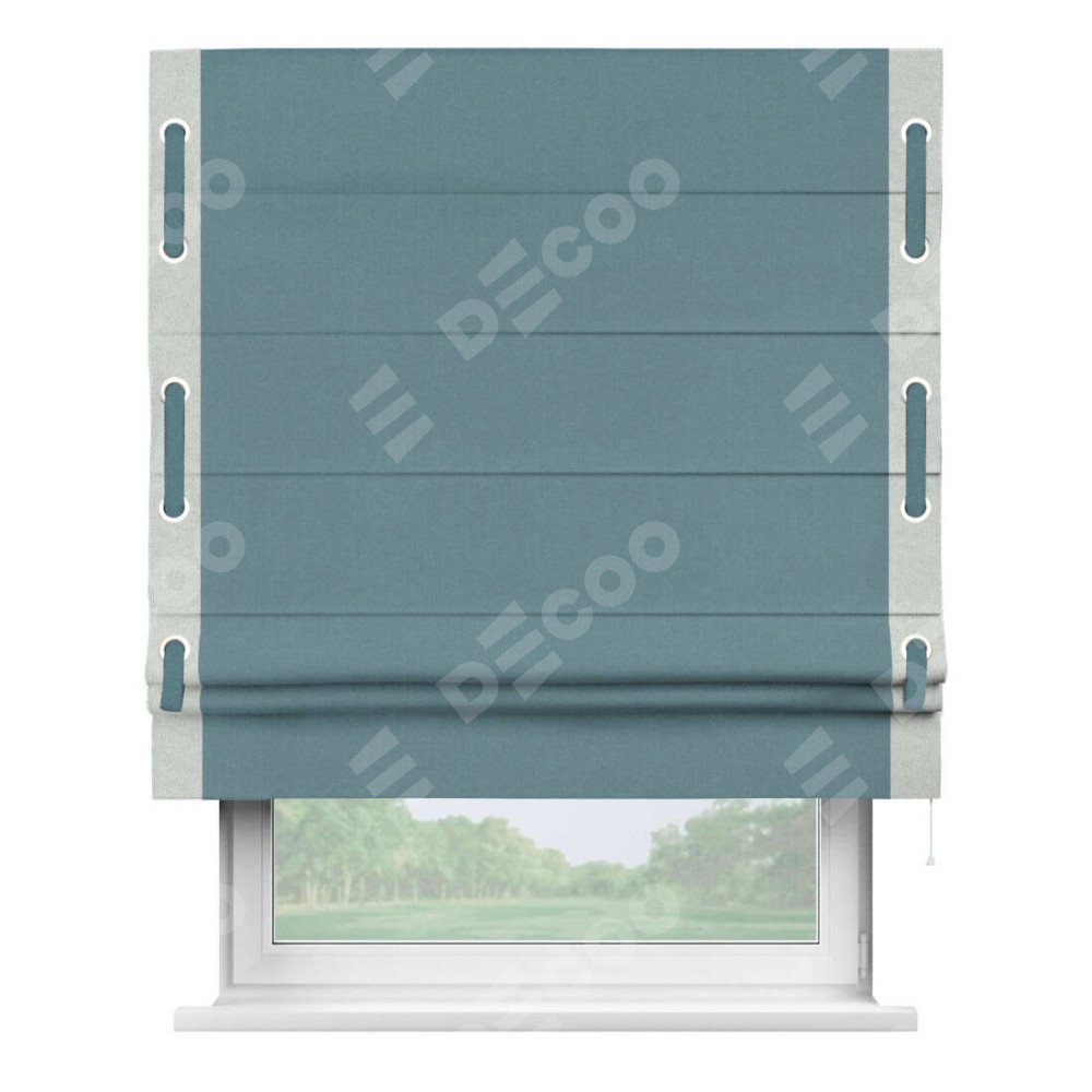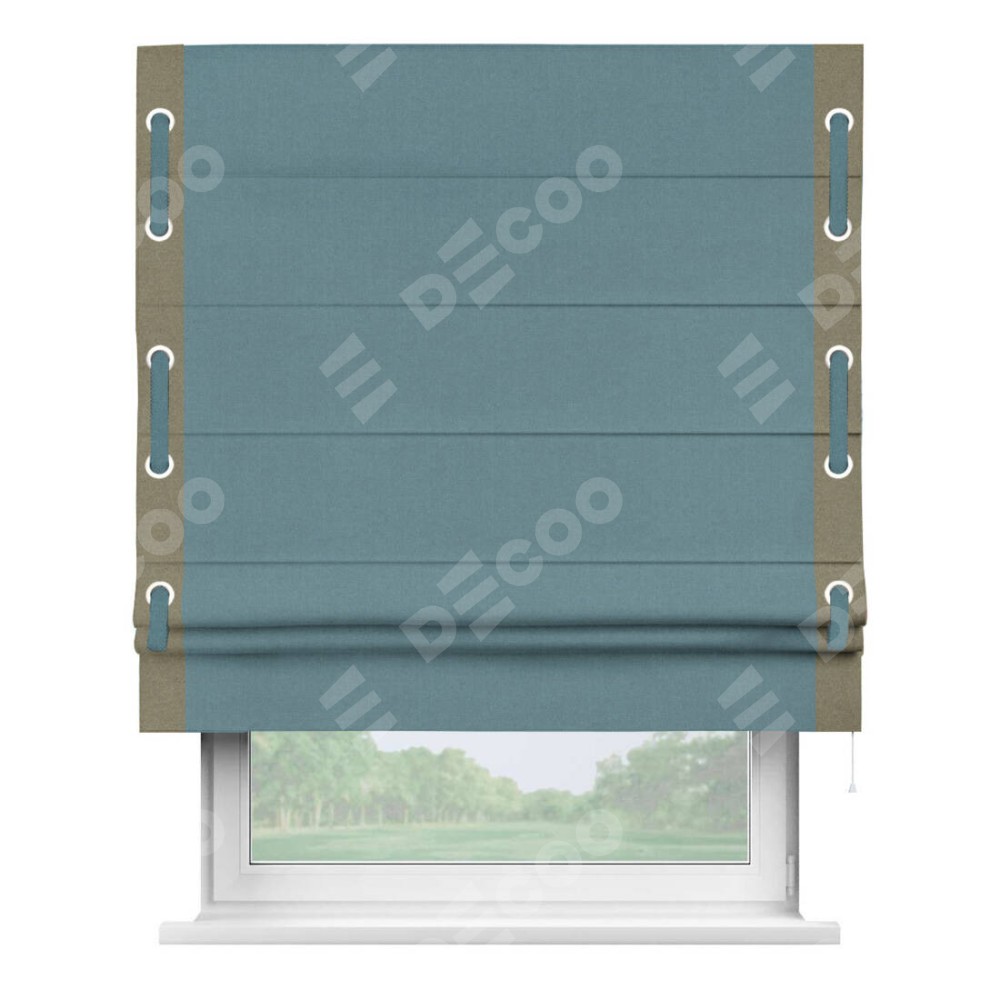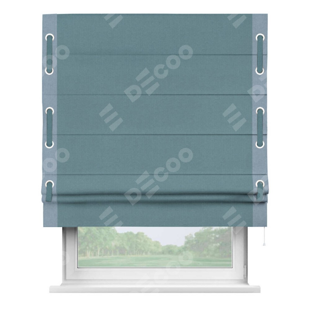 Римская штора производителя «Cortin», используется для проёма, пошита из ткани лён блэкаут синий, артикул 69528. Отделка шторы кантом «Стрим Дуо» на кантах расположены люверсы с пояском, ткань для канта используется из льна разной расцветки на выбор. Ткань для пояска обычно используется из основной ткани шторы, а так же можно сделать из любой расцветки по желанию. Имеет универсальный механизм и подходит для монтажа: на потолок, на стену и в нишу.