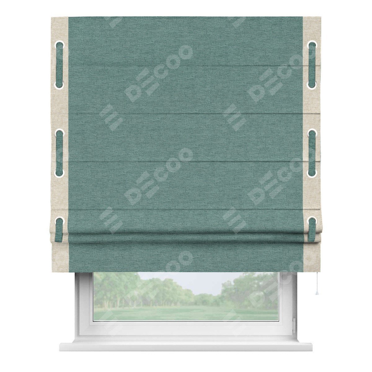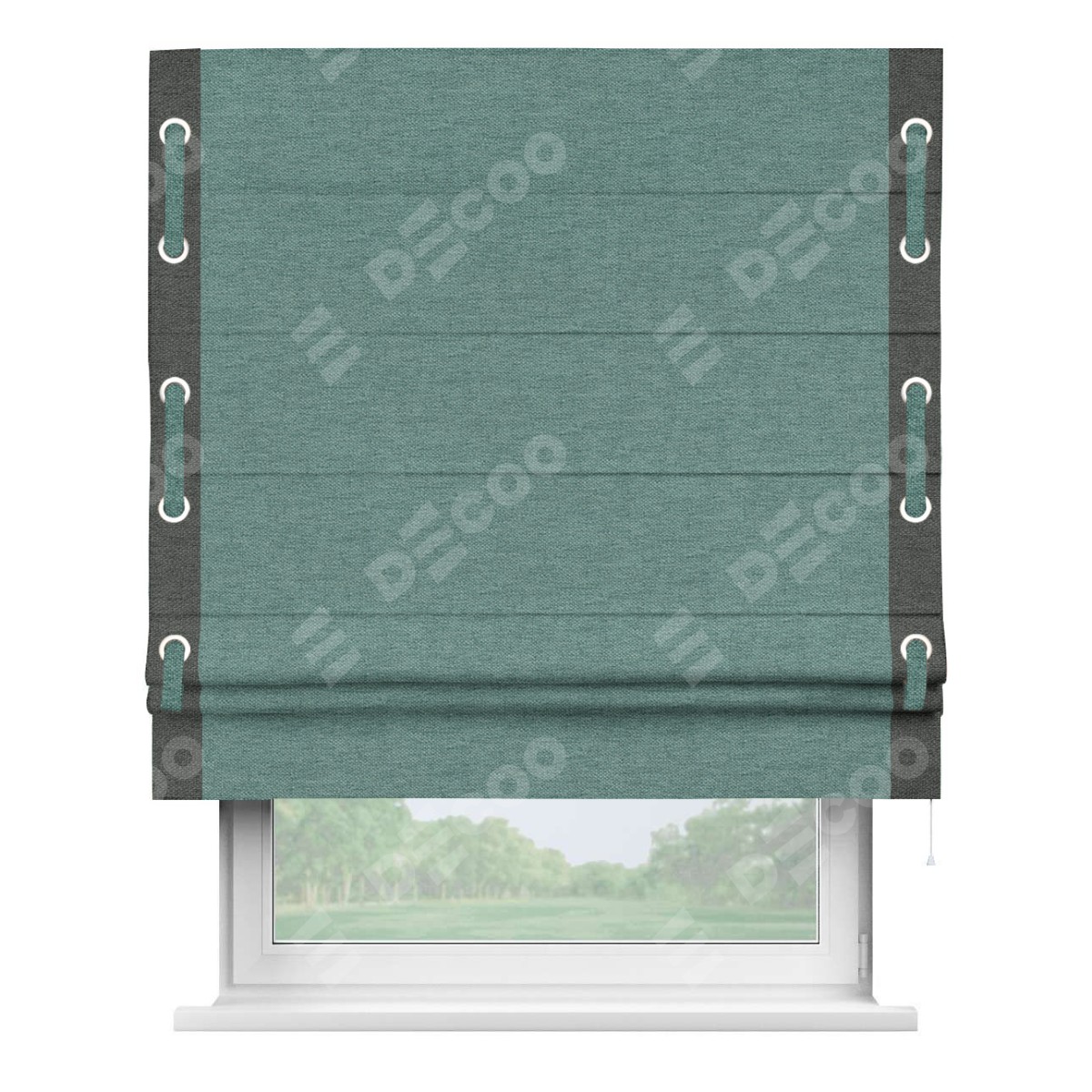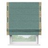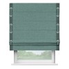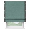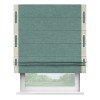 Римская штора производителя «Cortin», используется для проёма, пошита из ткани стиф димаут бирюзовый, артикул 18196. Отделка шторы кантом «Стрим Дуо» на кантах расположены люверсы с пояском, ткань для канта используется из стифа разной расцветки на выбор. Ткань для пояска обычно используется из основной ткани шторы, а так же можно сделать из любой расцветки по желанию. Имеет универсальный механизм и подходит для монтажа: на потолок, на стену и в нишу.
