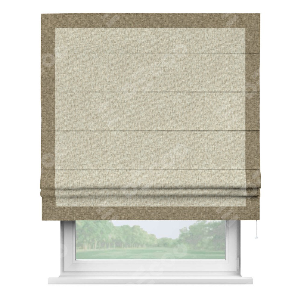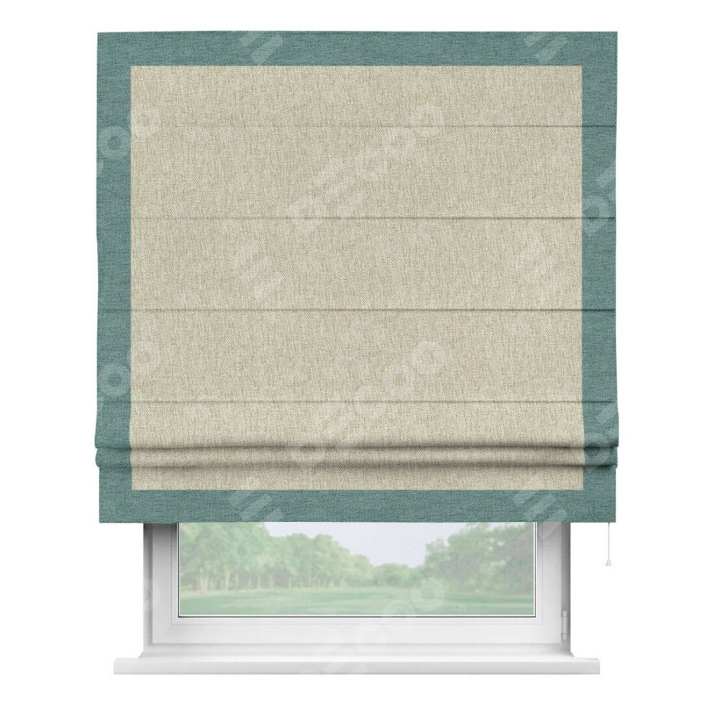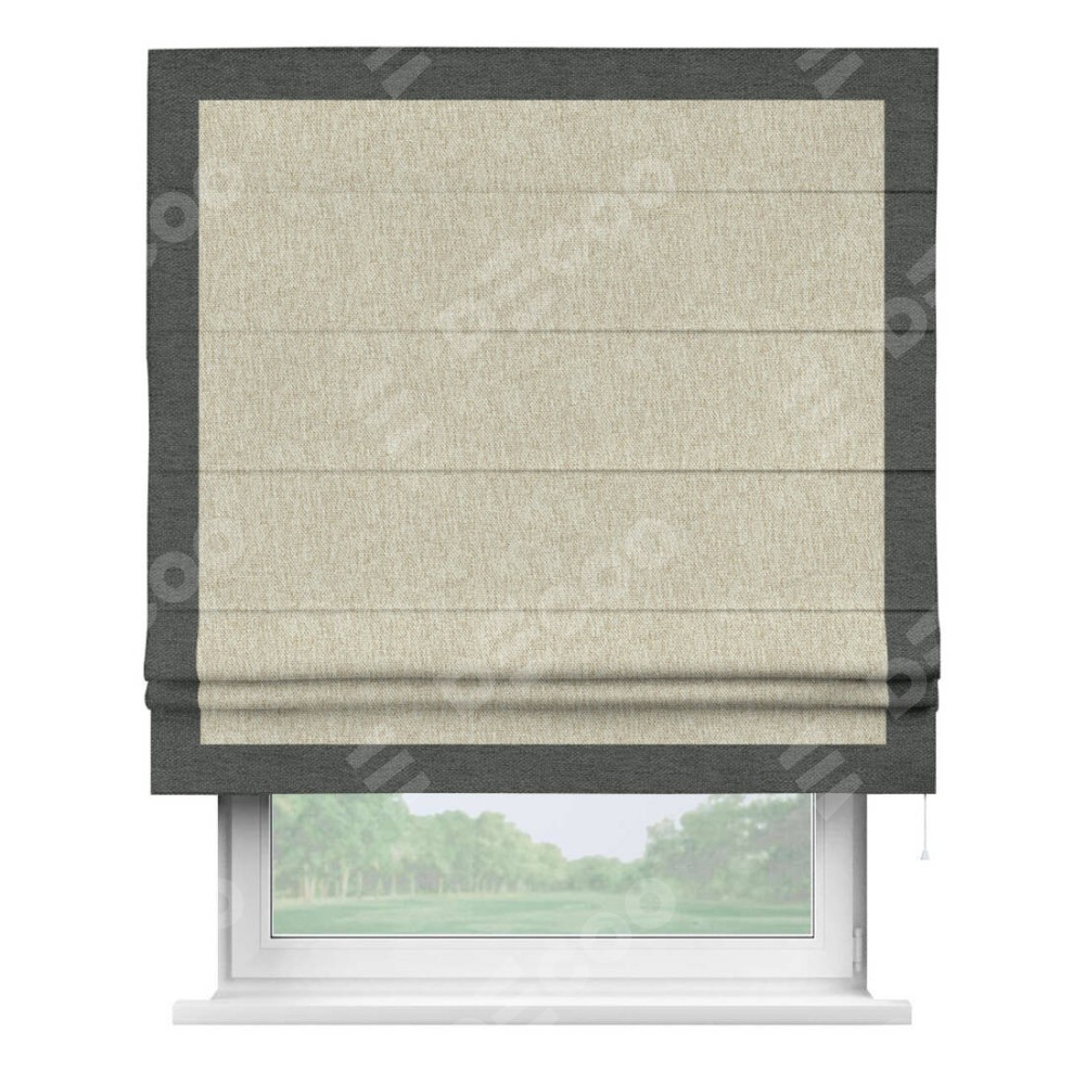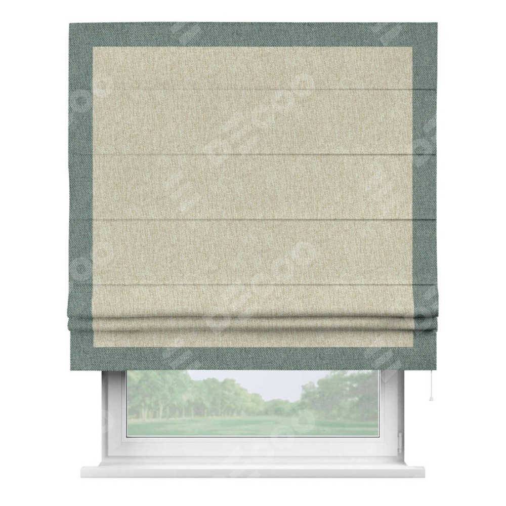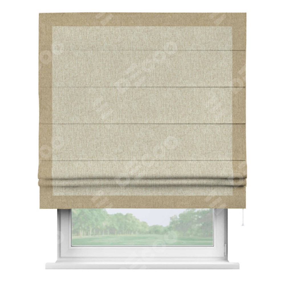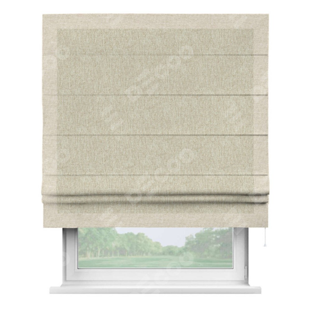 Римская штора производителя «Cortin», используется для проёма, пошита из ткани стиф димаут светло-бежевый, артикул 18084. Отделка шторы кантом «Чесс», ткань для канта используется из стифа разной расцветки на выбор. Имеет универсальный механизм и подходит для монтажа: на потолок, на стену и в нишу.