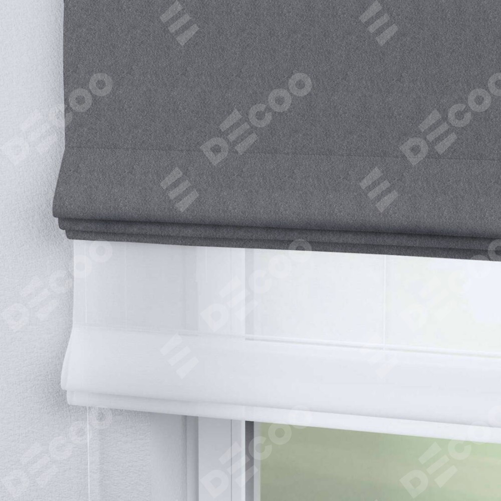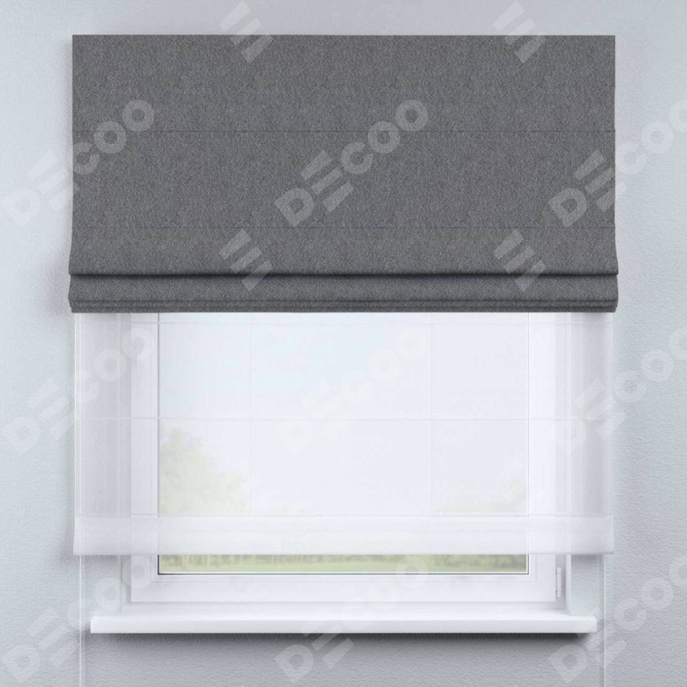 Римская штора день-ночь производителя «Cortin», используется для проёма, пошита из двух полотен, с лицевой стороны софт однотонный серый артикул 70605, вторая ткань тюль (по стандарту комплектуется тюль белого цвета артикул V-01). Имеет универсальный механизм и подходит для монтажа: на потолок, на стену и в нишу.