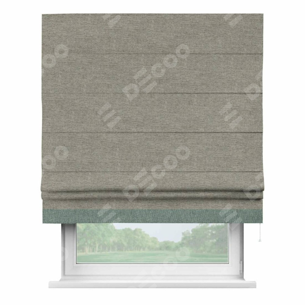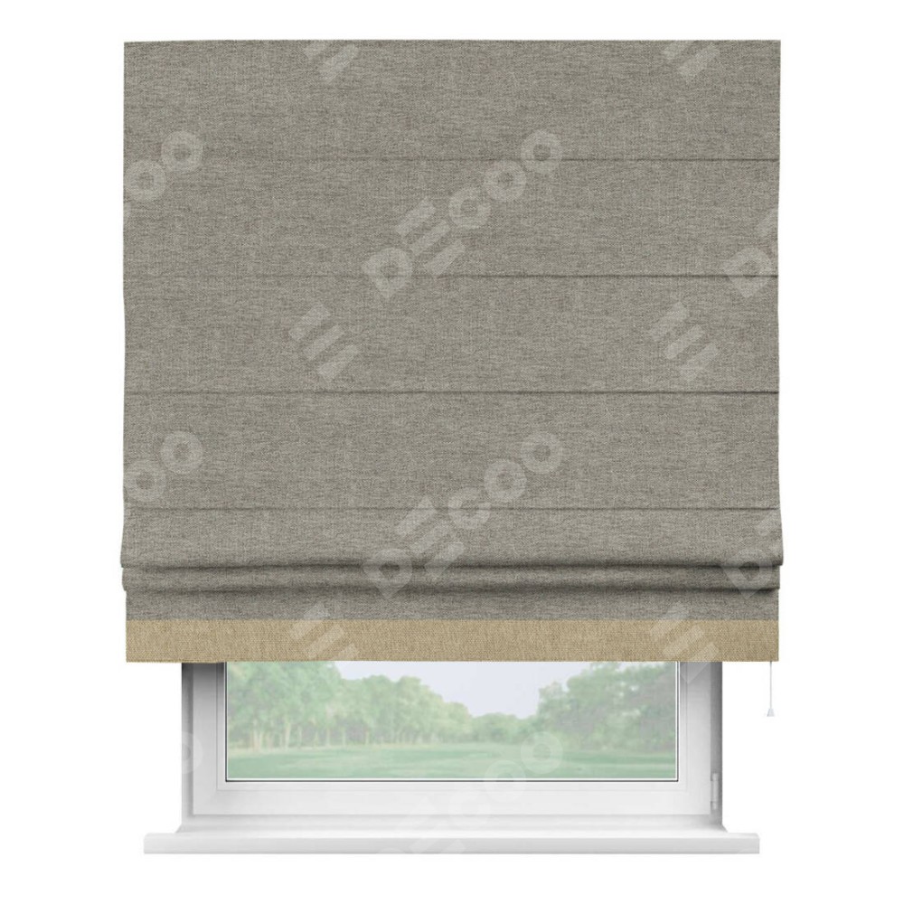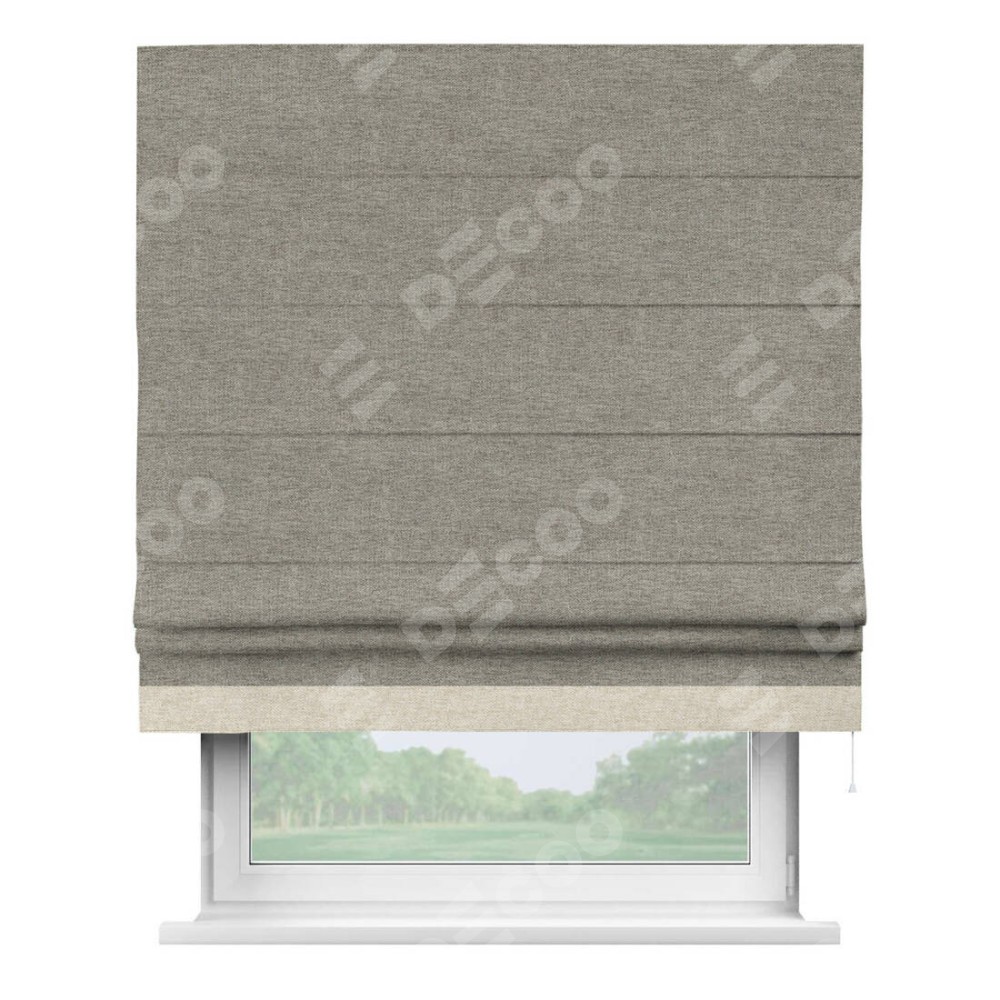 Римская штора производителя «Cortin», используется для проёма, пошита из ткани стиф димаут серо-коричневый, артикул 44028. Отделка шторы кантом «Джестер», ткань для канта используется из стифа разной расцветки на выбор. Имеет универсальный механизм и подходит для монтажа: на потолок, на стену и в нишу.