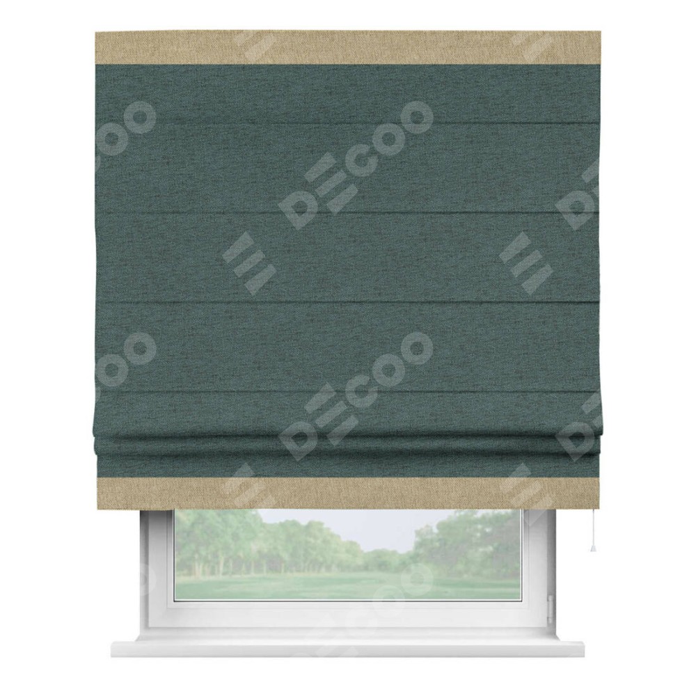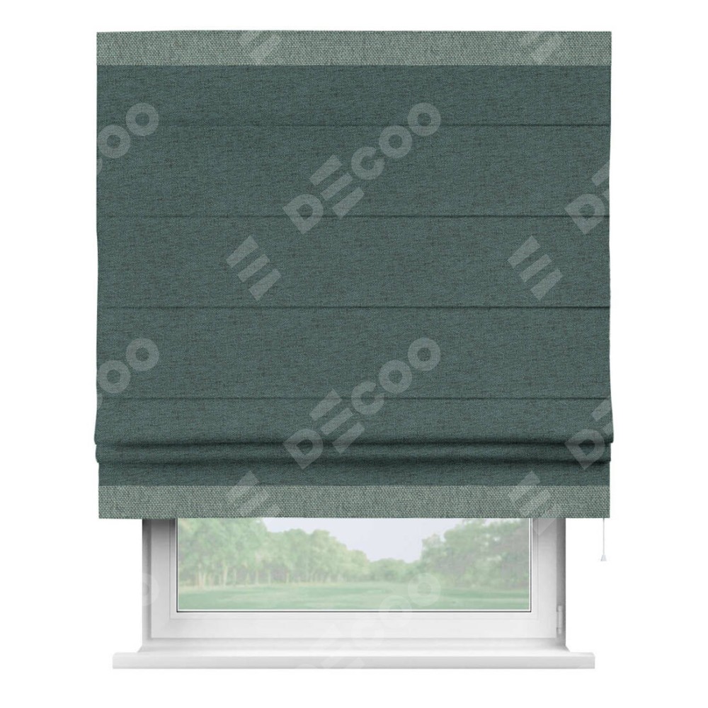 Римская штора производителя «Cortin», используется для проёма, пошита из ткани стиф димаут сине-зелёный, артикул 18194. Отделка шторы кантом «Горизонт», ткань для канта используется из стифа разной расцветки на выбор. Имеет универсальный механизм и подходит для монтажа: на потолок, на стену и в нишу.