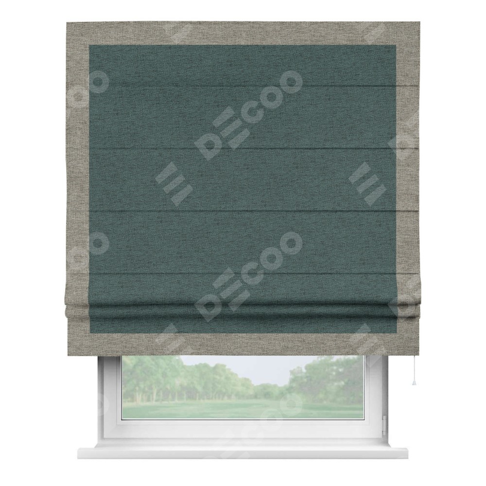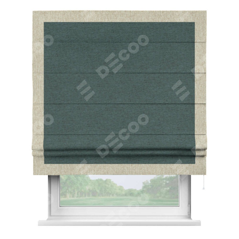 Римская штора производителя «Cortin», используется для проёма, пошита из ткани стиф димаут сине-зелёный, артикул 18194. Отделка шторы кантом «Чесс», ткань для канта используется из стифа разной расцветки на выбор. Имеет универсальный механизм и подходит для монтажа: на потолок, на стену и в нишу.