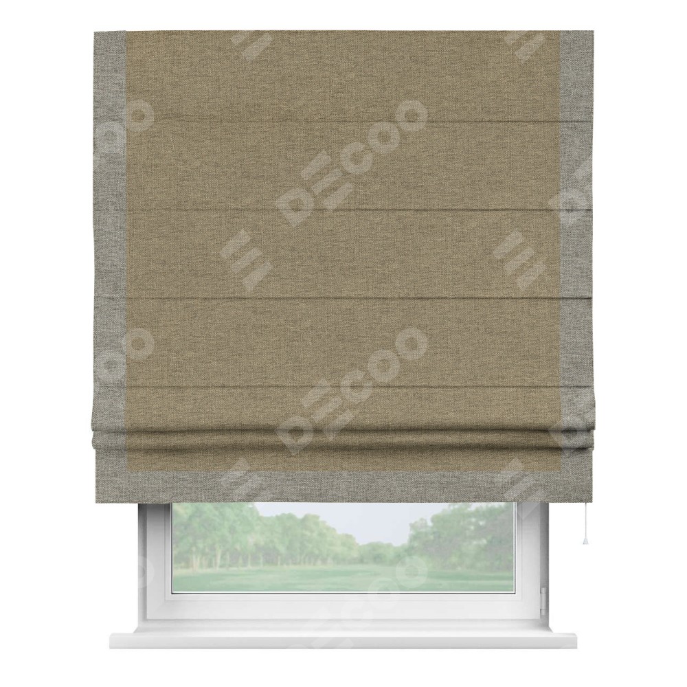 Римская штора производителя «Cortin», используется для проёма, пошита из ткани стиф димаут тёмно-бежевый, артикул 18085. Отделка шторы кантом «Виктория», ткань для канта используется из стифа разной расцветки на выбор. Имеет универсальный механизм и подходит для монтажа: на потолок, на стену и в нишу.