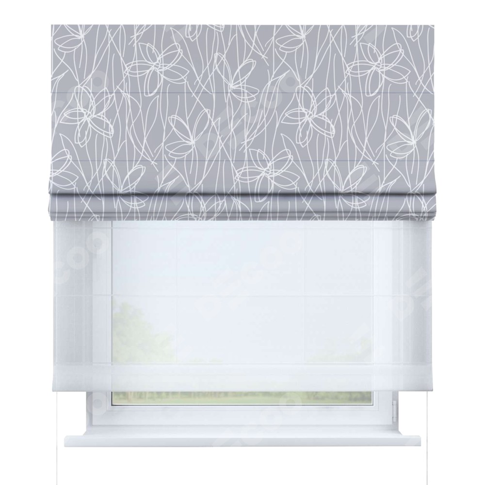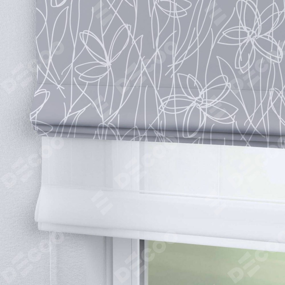 Римская штора день-ночь производителя «Cortin», используется для проёма, пошита из двух полотен, с лицевой блэкаут с нанесением сублимационной печати «Нарисованные цветы», вторая ткань тюль (по стандарту комплектуется тюль белого цвета артикул V-01). Имеет универсальный механизм и подходит для монтажа: на потолок, на стену и в нишу.