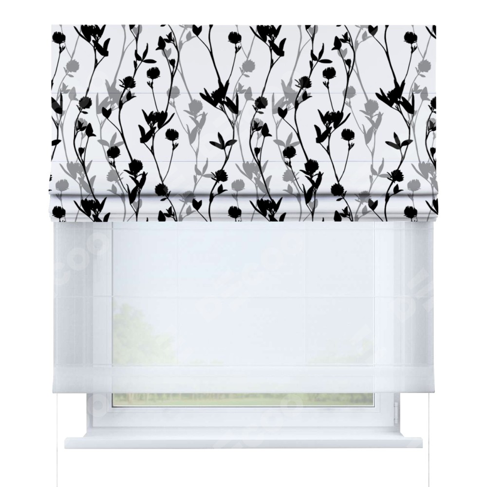 Римская штора день-ночь производителя «Cortin», используется для проёма, пошита из двух полотен, с лицевой блэкаут с нанесением сублимационной печати «Цветочный силуэт», вторая ткань тюль (по стандарту комплектуется тюль белого цвета артикул V-01). Имеет универсальный механизм и подходит для монтажа: на потолок, на стену и в нишу.