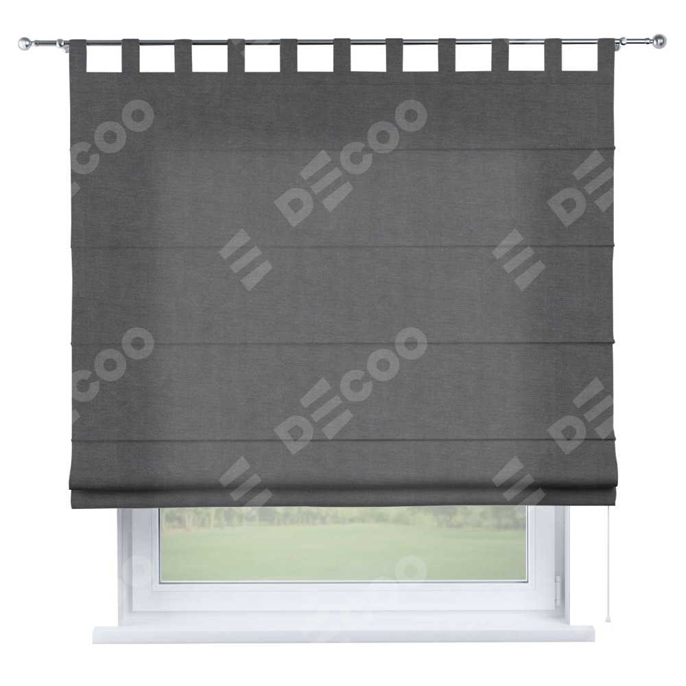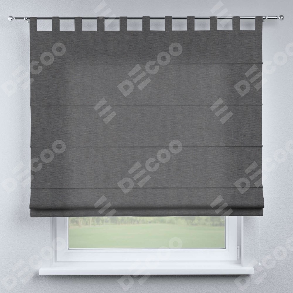 Римская штора производителя «Cortin», используется для проёма, пошита из ткани канвас мокрый асфальт, артикул ткани v-1083. Данная модель пошита на петлях, комплектуется на выбор круглым карнизом и подходит для монтажа на стену. Римская штора на петлях имеет простую систему регулировки высоты, отличительным преимуществом данной модели является простой способ монтажа. Достаточно повесить ее на трубу и штора готова!