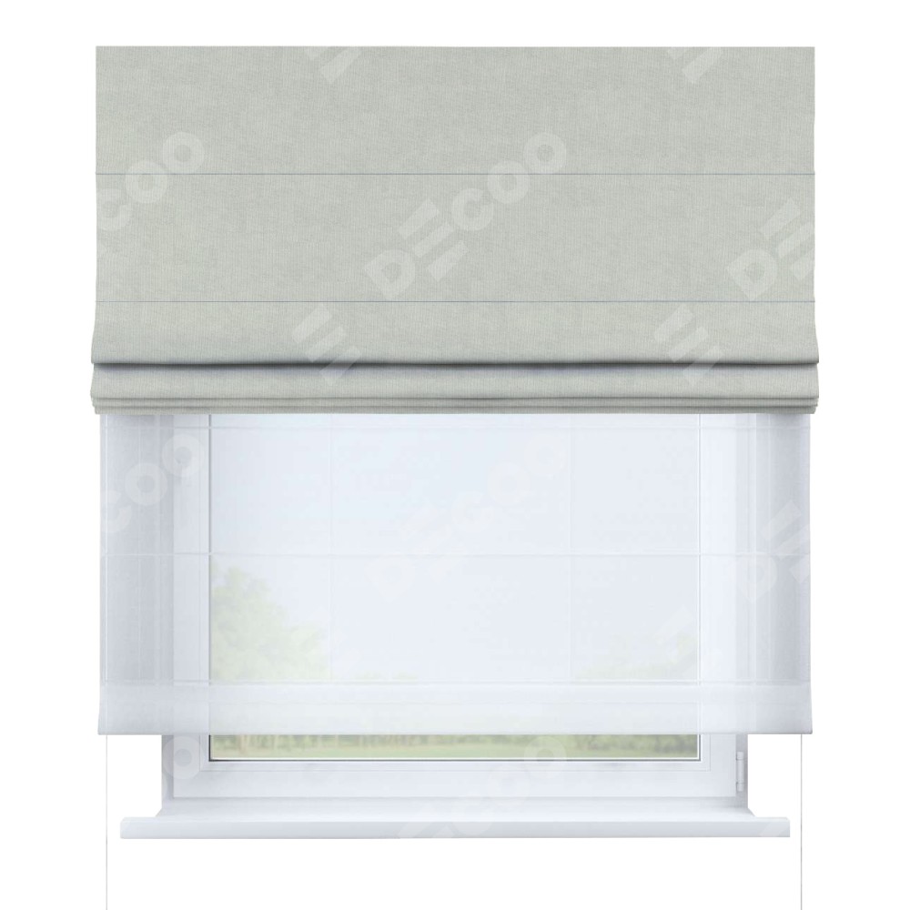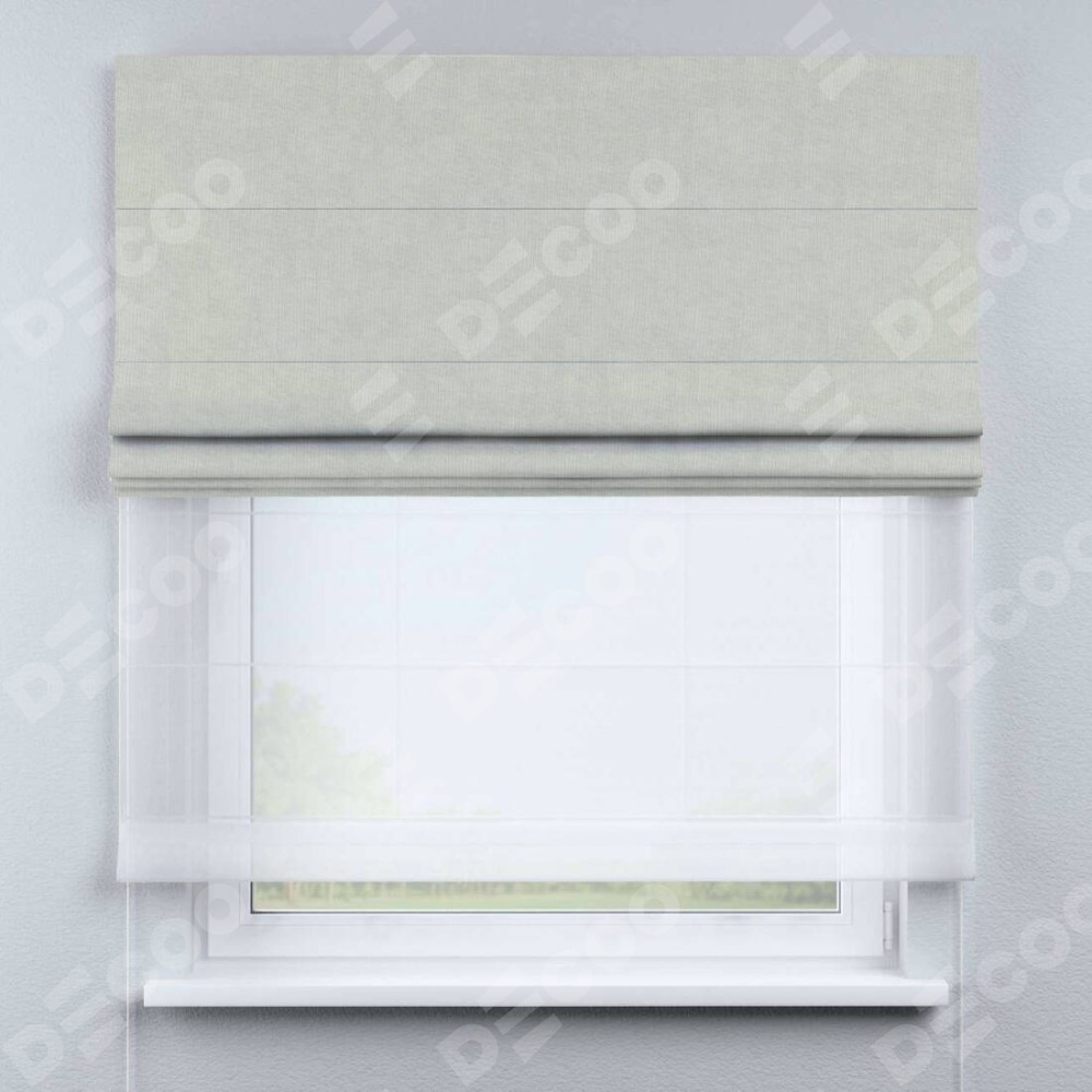Римская штора день-ночь производителя «Cortin», используется для проёма, пошита из двух полотен, с лицевой стороны канвас светло-серый артикул v-371, вторая ткань тюль (по стандарту комплектуется тюль белого цвета артикул V-01). Имеет универсальный механизм и подходит для монтажа: на потолок, на стену и в нишу.