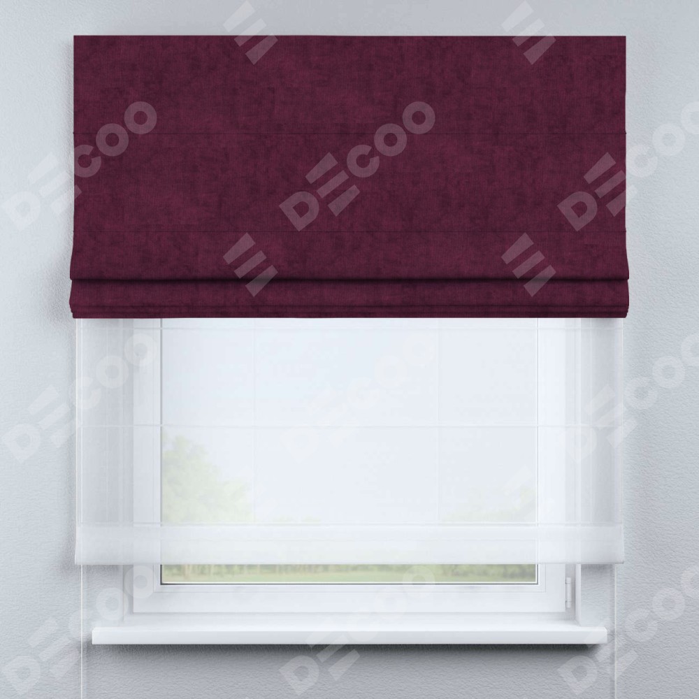 Римская штора день-ночь производителя «Cortin», используется для проёма, пошита из двух полотен, с лицевой стороны канвас фиолетовый артикул v-99, вторая ткань тюль (по стандарту комплектуется тюль белого цвета артикул V-01). Имеет универсальный механизм и подходит для монтажа: на потолок, на стену и в нишу.
