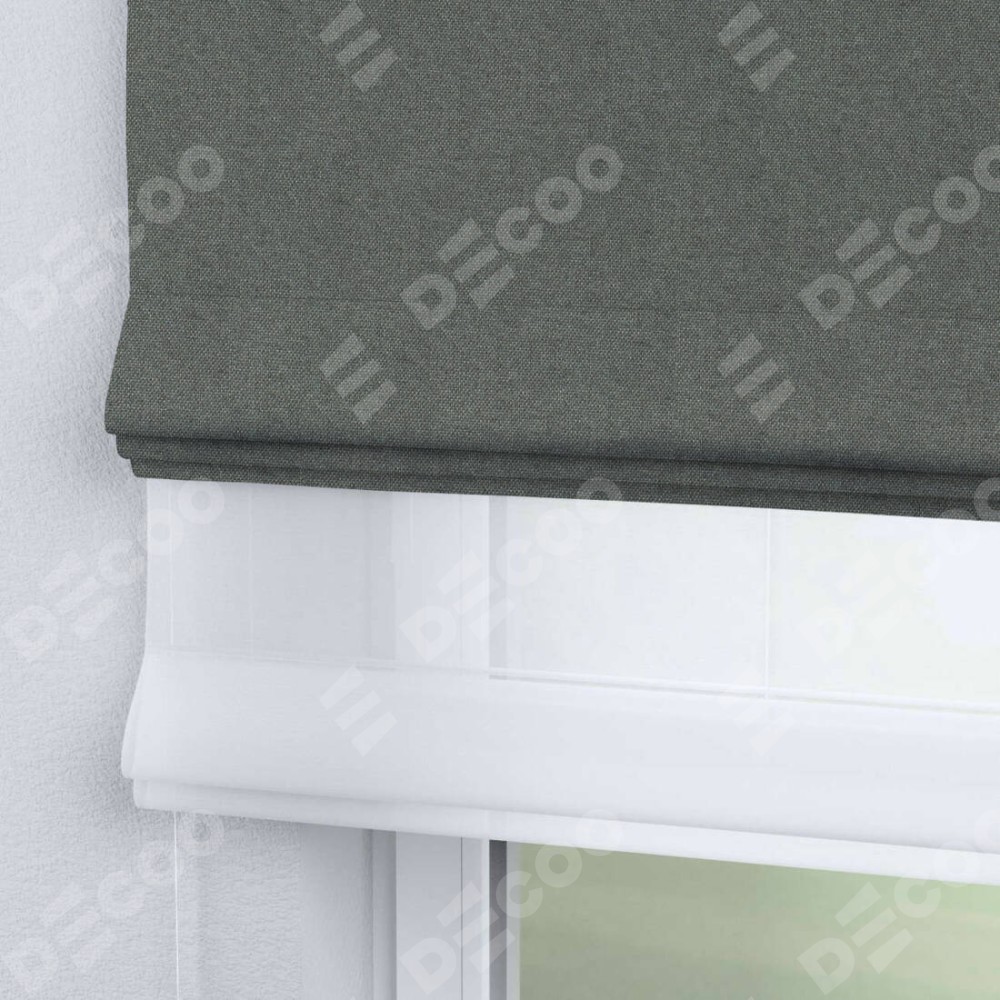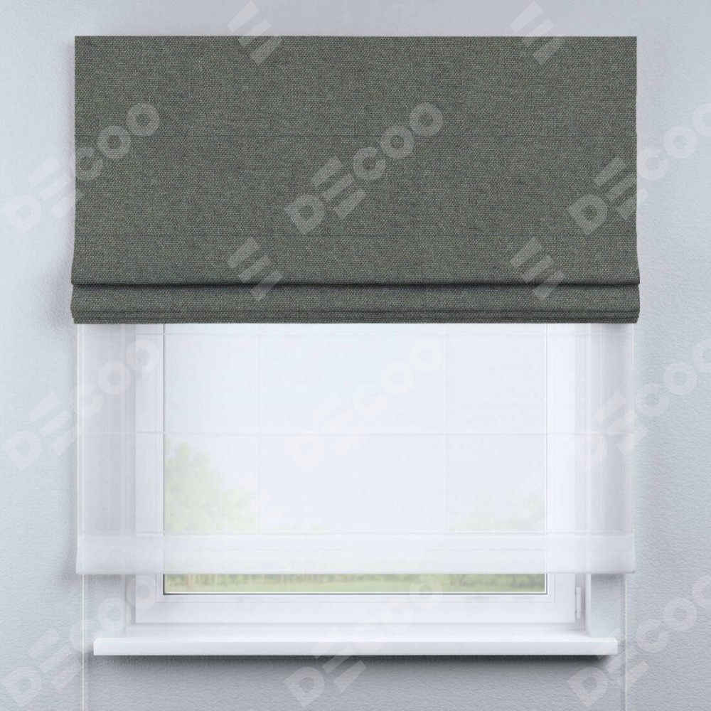 Римская штора день-ночь производителя «Cortin», используется для проёма, пошита из двух полотен, с лицевой стороны лён димаут тёмно-серый артикул 91011, вторая ткань тюль (по стандарту комплектуется тюль белого цвета артикул V-01). Имеет универсальный механизм и подходит для монтажа: на потолок, на стену и в нишу.
