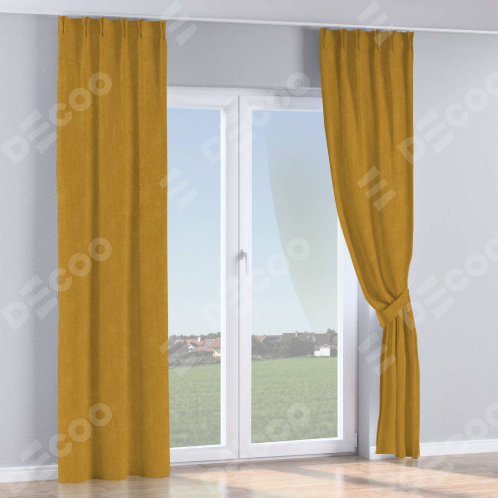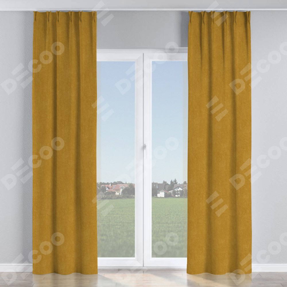 Комплект прямых штор, от производителя «Cortin», пошиты из ткани канвас горчица, артикул ткани v-476. С изнаночной стороны в верхней части штор пристрачивается шторная лента с декоративными складками «Кустик». Для создания элегантных складок прямые шторы шьются по стандарту с коэффициентом 1:2 (на 100 см. ширины проёма 200 см. ширины ткани).