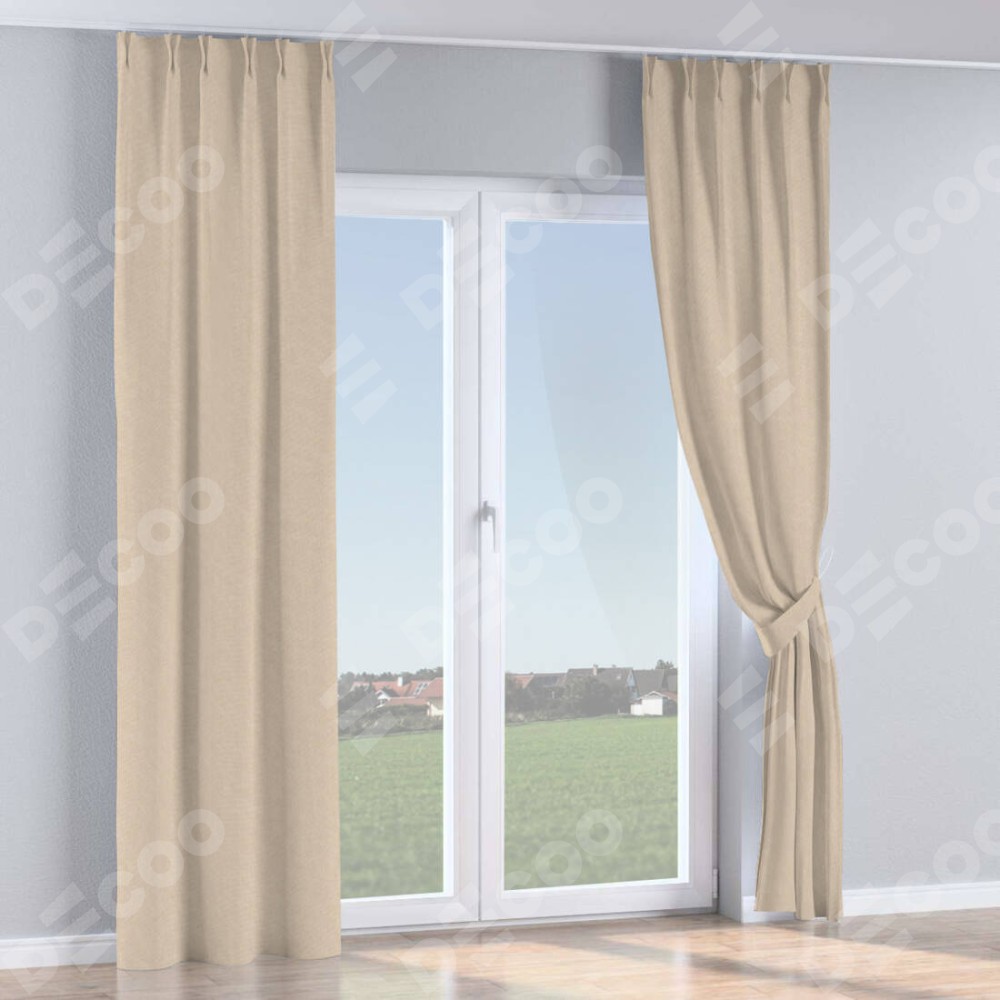 Комплект прямых штор, от производителя «Cortin», пошиты из ткани канвас кофе с молоком, артикул ткани v-07. С изнаночной стороны в верхней части штор пристрачивается шторная лента с декоративными складками «Кустик». Для создания элегантных складок прямые шторы шьются по стандарту с коэффициентом 1:2 (на 100 см. ширины проёма 200 см. ширины ткани).