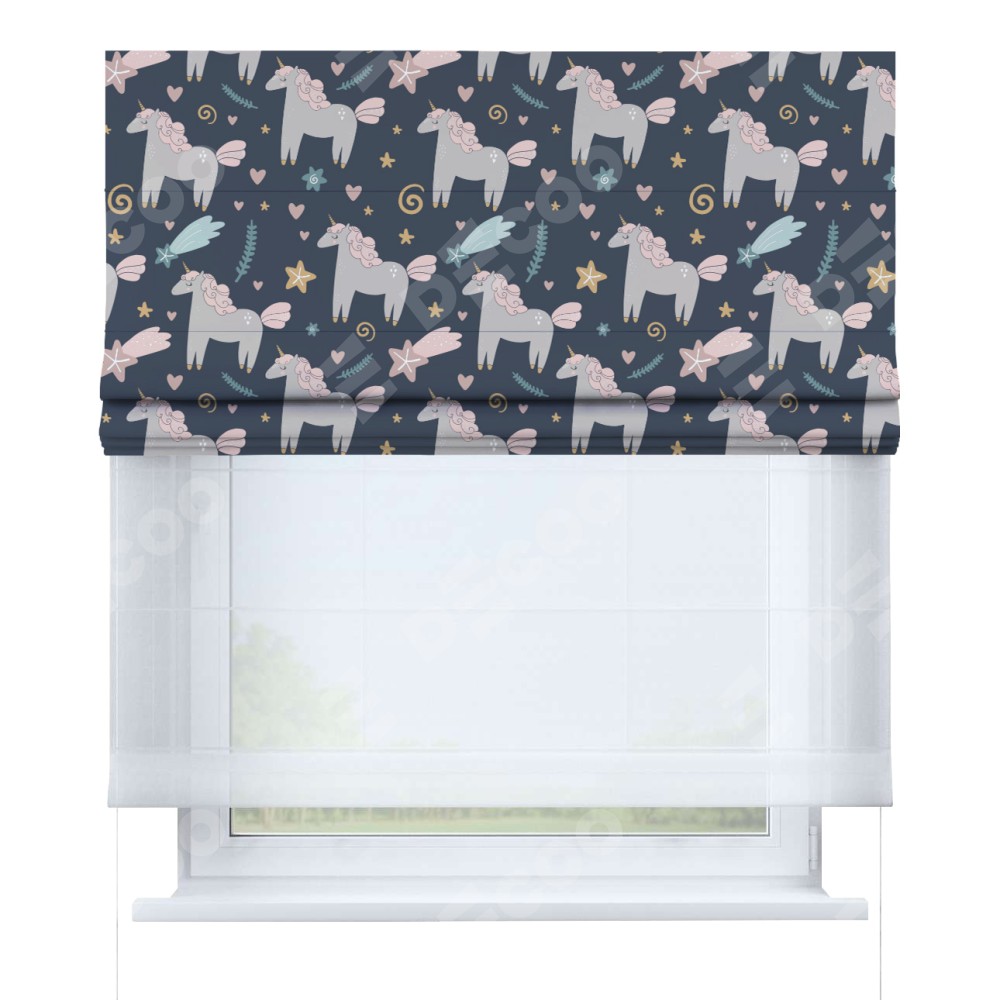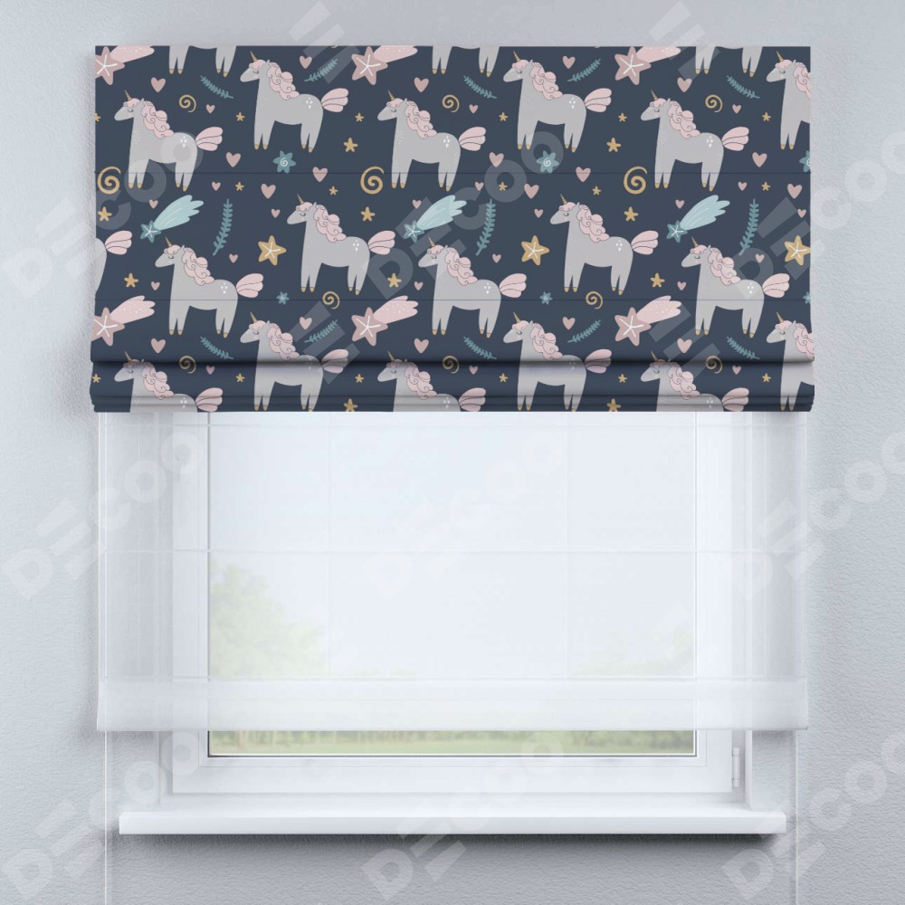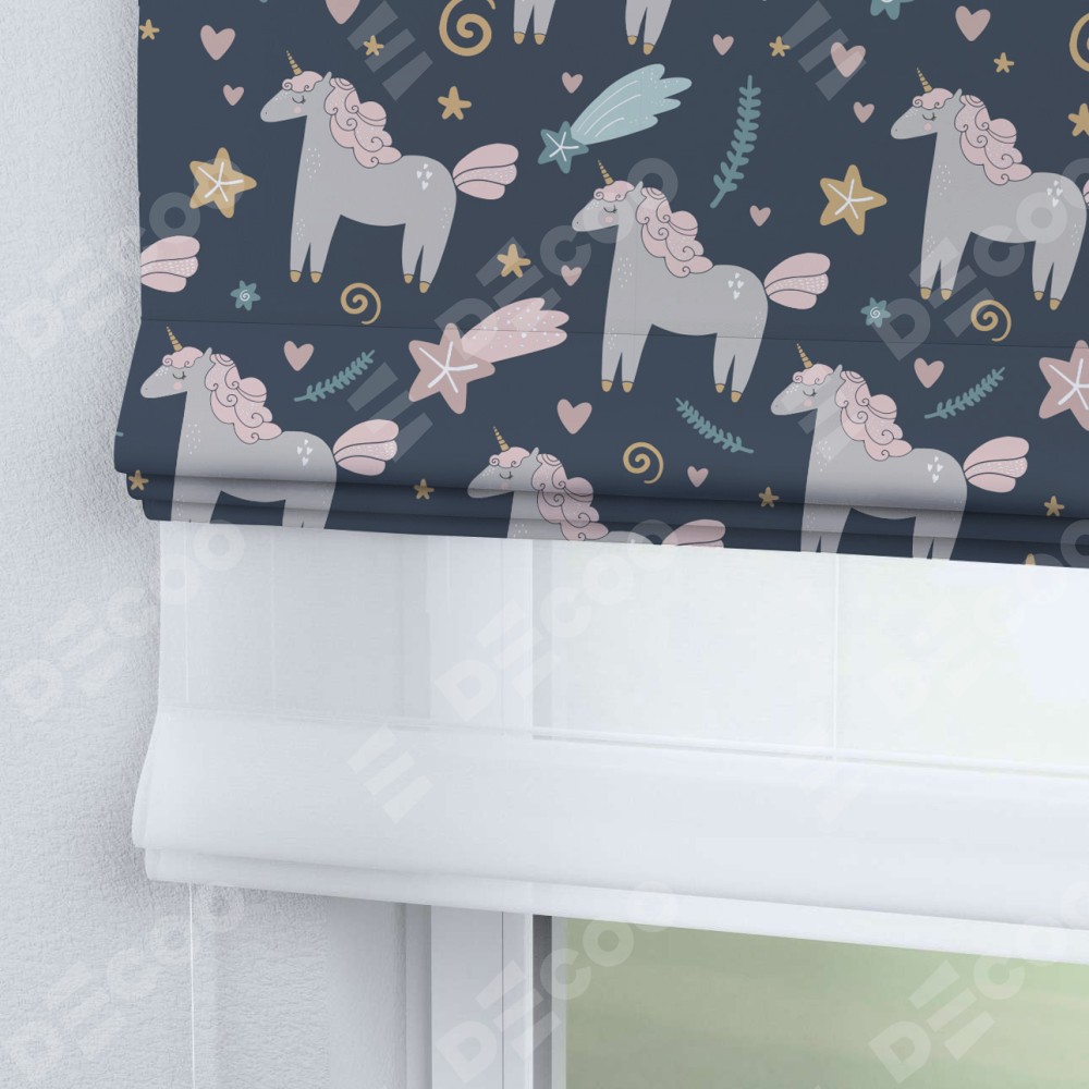 Римская штора день-ночь производителя «Cortin», используется для проёма, пошита из двух полотен, с лицевой блэкаут с нанесением сублимационной печати «Милые единороги», вторая ткань тюль (по стандарту комплектуется тюль белого цвета артикул V-01). Имеет универсальный механизм и подходит для монтажа: на потолок, на стену и в нишу.