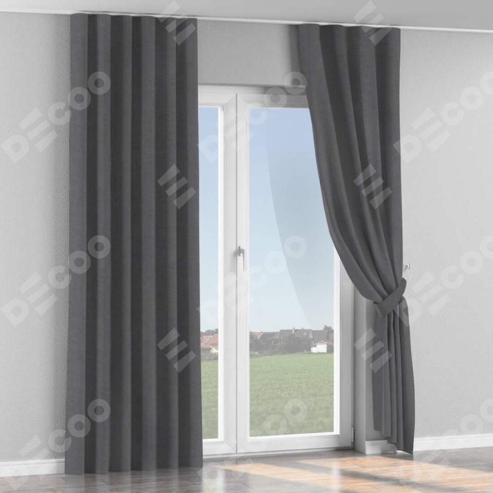 Комплект прямых штор, от производителя «Cortin», пошиты из ткани канвас мокрый асфальт, артикул ткани v-1083. С изнаночной стороны в верхней части штор пристрачивается шторная лента с декоративными складками «Волна». Для создания элегантных складок прямые шторы шьются по стандарту с коэффициентом 1:2 (на 100 см. ширины проёма 200 см. ширины ткани).