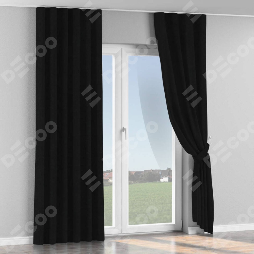 Комплект прямых штор, от производителя «Cortin», пошиты из ткани канвас черный, артикул ткани v-194. С изнаночной стороны в верхней части штор пристрачивается шторная лента с декоративными складками «Волна». Для создания элегантных складок прямые шторы шьются по стандарту с коэффициентом 1:2 (на 100 см. ширины проёма 200 см. ширины ткани).