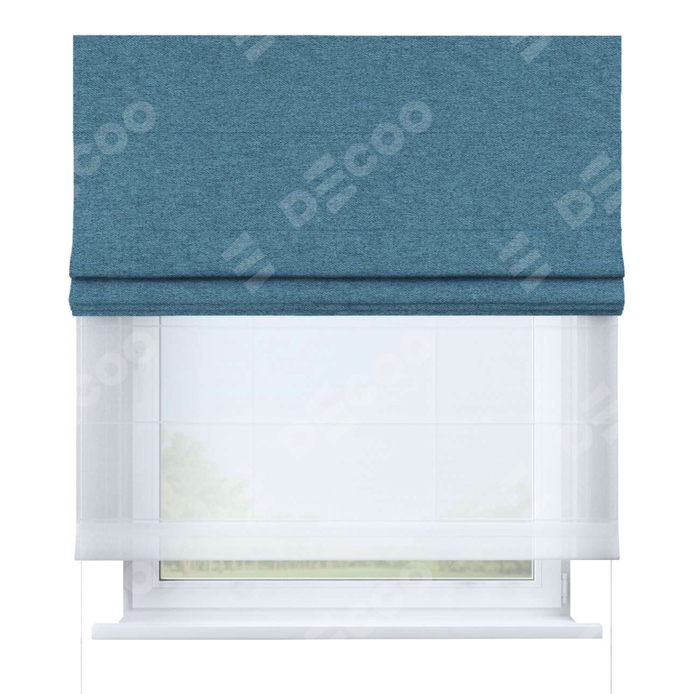 Римская штора день-ночь производителя «Cortin», используется для проёма, пошита из двух полотен, с лицевой стороны твид блэкаут светло-синий артикул 90935, вторая ткань тюль (по стандарту комплектуется тюль белого цвета артикул V-01). Имеет универсальный механизм и подходит для монтажа: на потолок, на стену и в нишу.