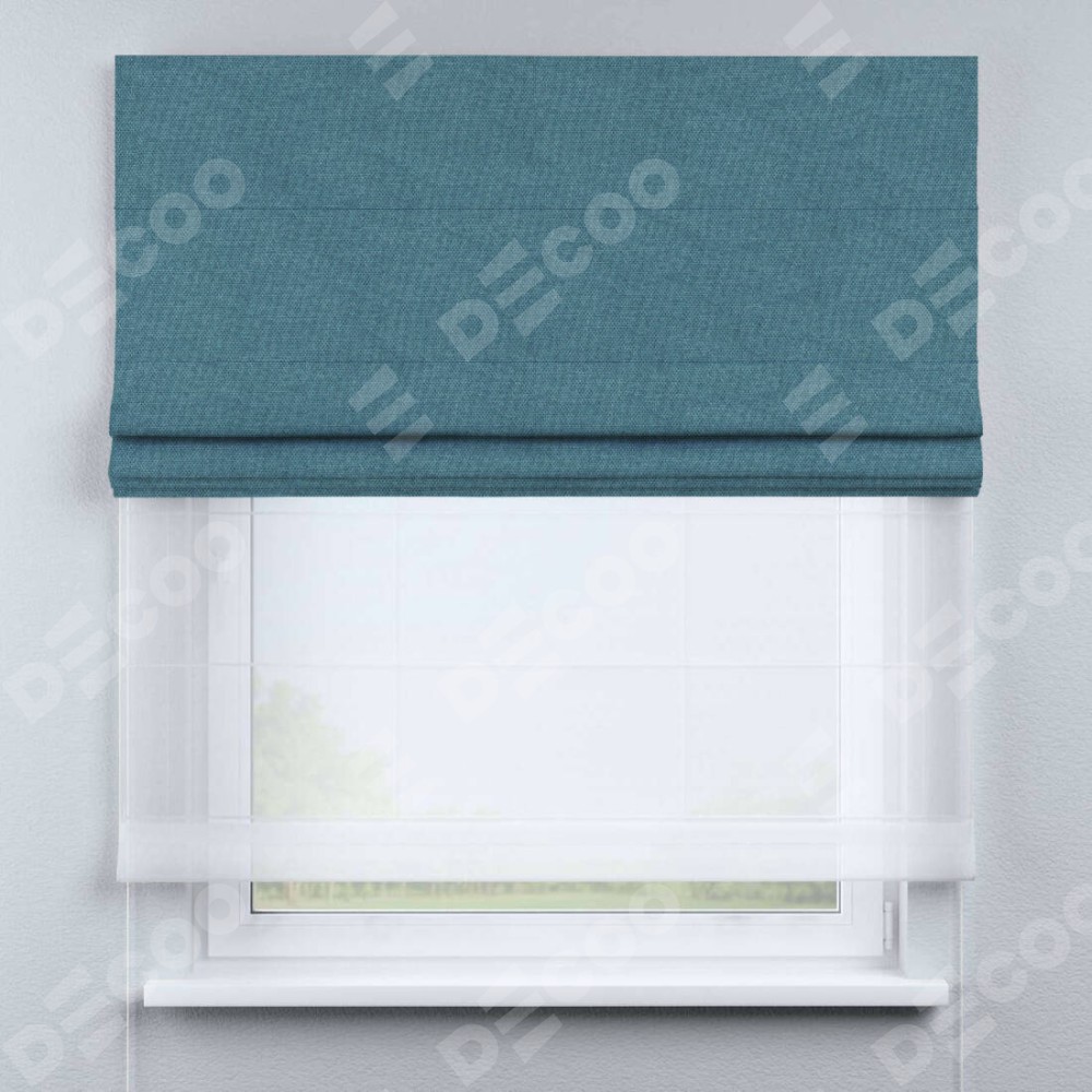 Двойная римская штора «День-ночь» от производителя Cortin предназначена для использования в проёмах. Эта штора уникальна тем, что состоит из двух полотен. На лицевой стороне находится лён димаут светло-синий (артикул: 91007), обеспечивающий эффективное затемнение. В комплект также входит вторая ткань — легкий белый тюль (артикул: V-01), который добавляет изящества и легкости оформлению окна. Кроме того, доступны и другие разновидности ткани тюль, выбор которых доступен по  ссылке .