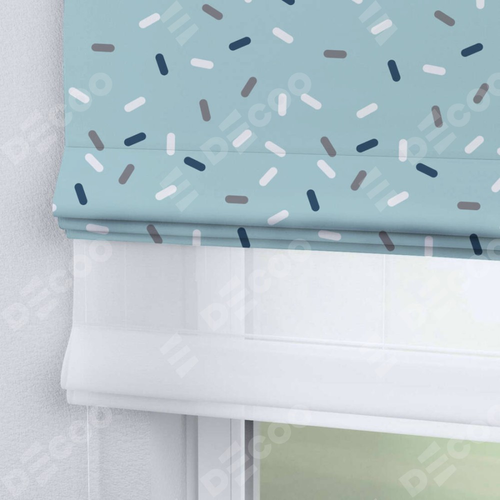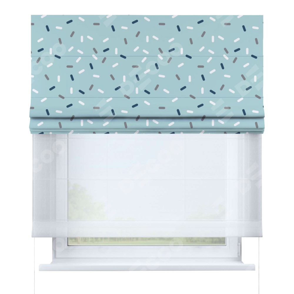 Римская штора день-ночь производителя «Cortin», используется для проёма, пошита из двух полотен, с лицевой блэкаут с нанесением сублимационной печати «Короткие линии», вторая ткань тюль (по стандарту комплектуется тюль белого цвета артикул V-01). Имеет универсальный механизм и подходит для монтажа: на потолок, на стену и в нишу.
