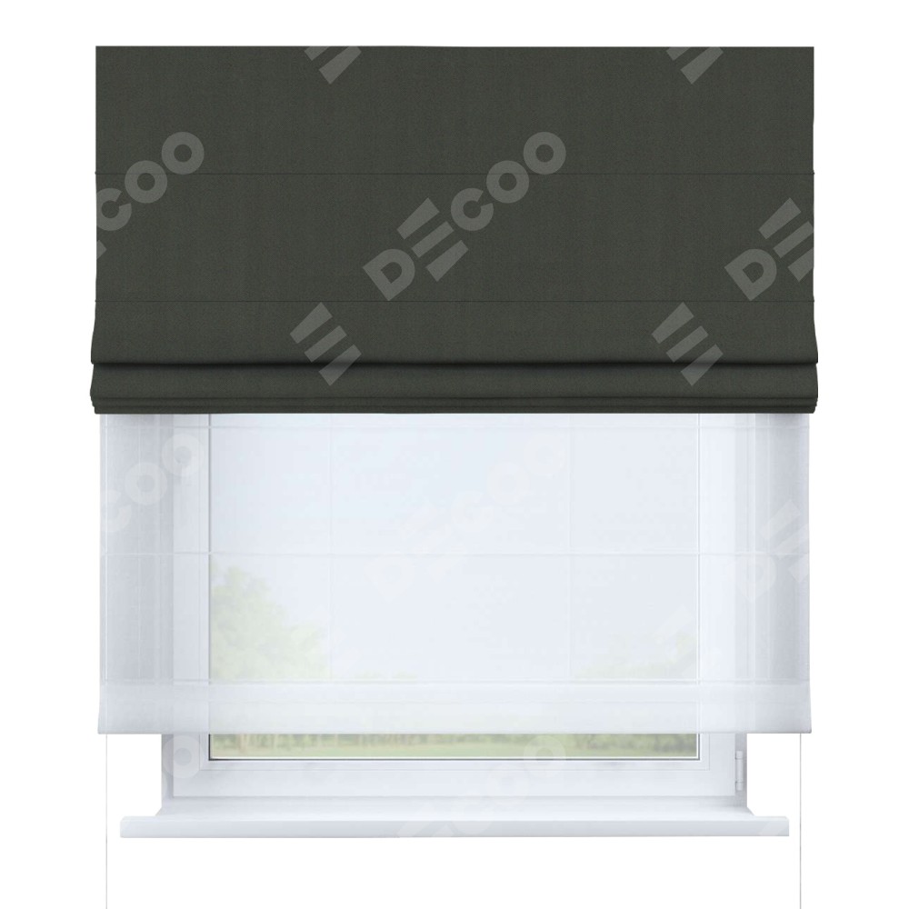 Двойная римская штора «День-ночь» от производителя Cortin предназначена для использования в проёмах. Эта штора уникальна тем, что состоит из двух полотен. На лицевой стороне находится однотонный дымчато-серый блэкаут (артикул: 91571−1), обеспечивающий эффективное затемнение. В комплект также входит вторая ткань — легкий белый тюль (артикул: V-01), который добавляет изящества и легкости оформлению окна. Кроме того, доступны и другие разновидности ткани тюль, выбор которых доступен по  ссылке .