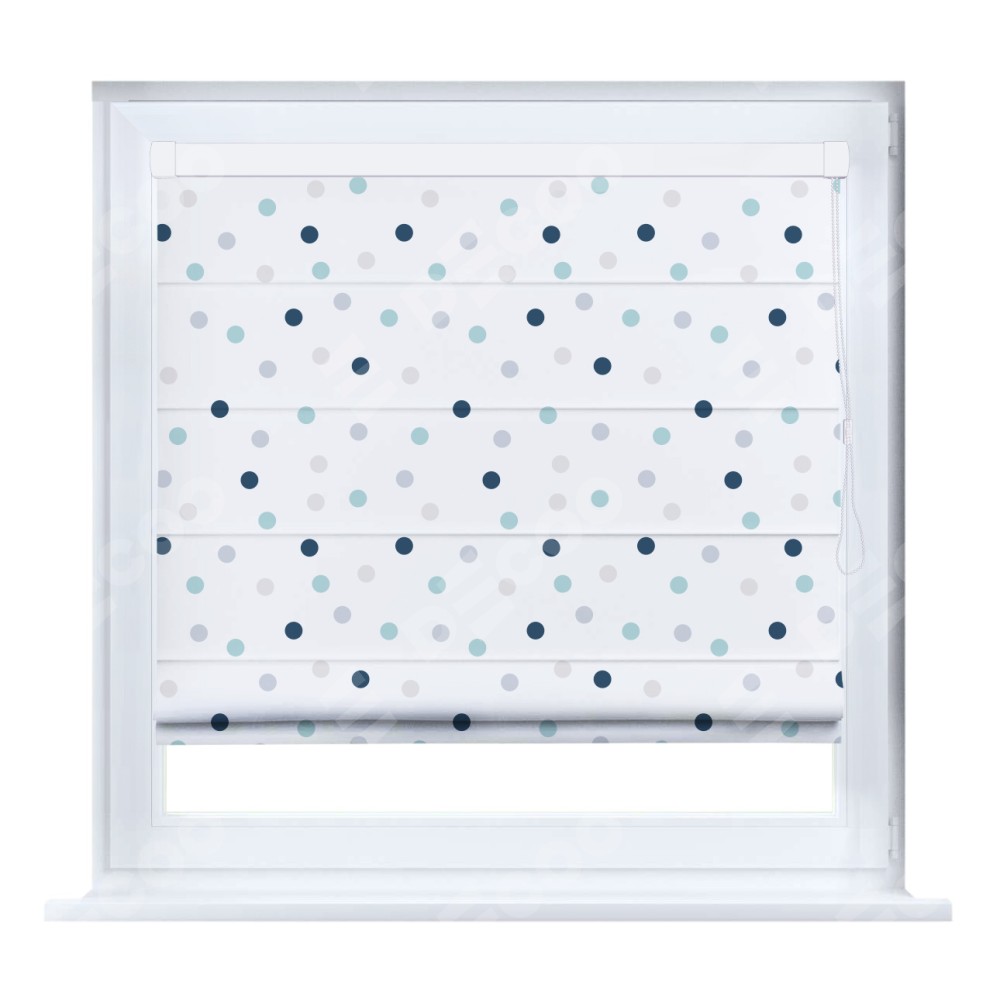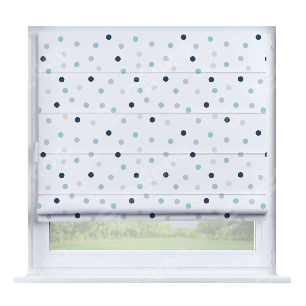 Римская штора производителя «Cortin», устанавливается на створку окна, пошита из ткани блэкаут с нанесением сублимационной печати «Точки». Штора шьётся по индивидуальным размерам, для данного типа римской шторы возможная ширина от 35 до 150 см., высота до 250 см.