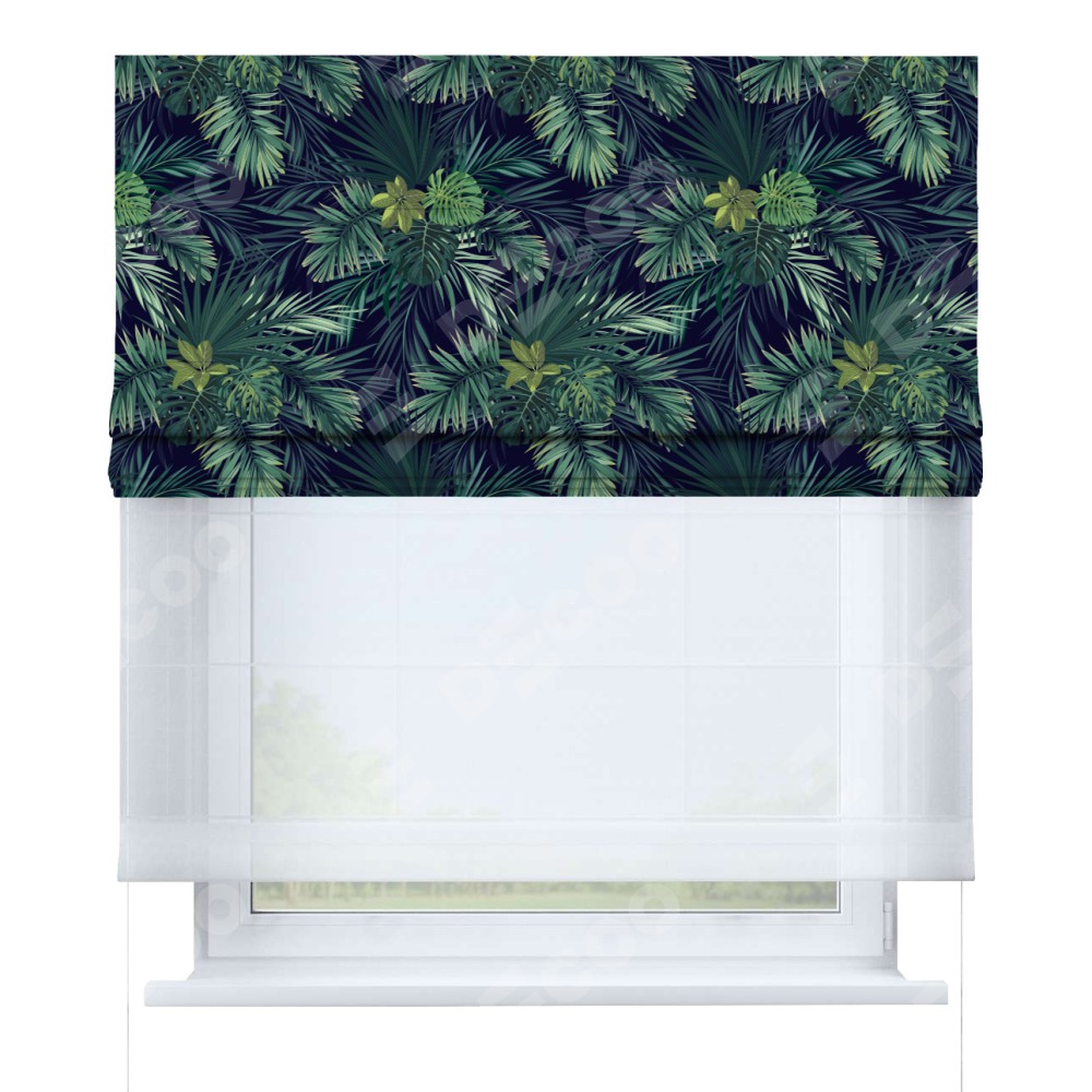 Римская штора день-ночь производителя «Cortin», используется для проёма, пошита из двух полотен, с лицевой блэкаут с нанесением сублимационной печати «Пальмовые листья», вторая ткань тюль (по стандарту комплектуется тюль белого цвета артикул V-01). Имеет универсальный механизм и подходит для монтажа: на потолок, на стену и в нишу.