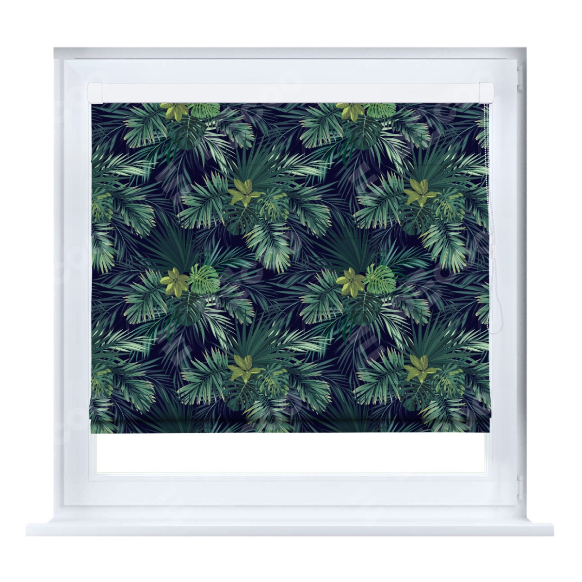 Римская штора кассетного типа, производителя «Cortin», устанавливается только на пластиковые окна и прилегает к стеклопакету, пошита из ткани блэкаут с нанесением сублимационной печати «Пальмовые листья».