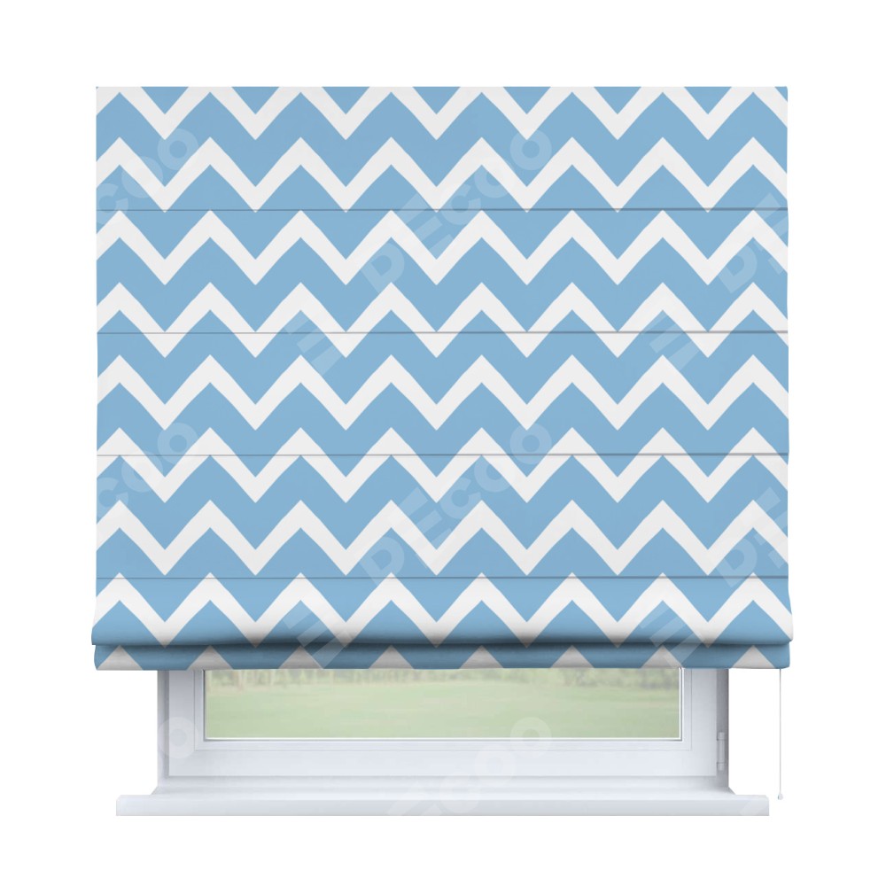 Римская штора производителя «Cortin», используется для проёма, пошита из ткани блэкаут с нанесением сублимационной печати «Зигзаг средний». Имеет универсальный механизм и подходит для монтажа: на потолок, на стену и в нишу.