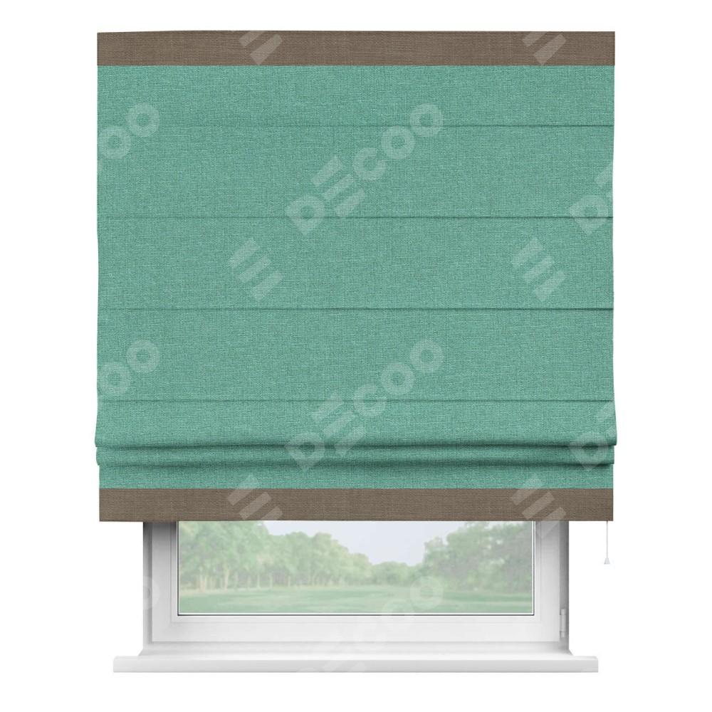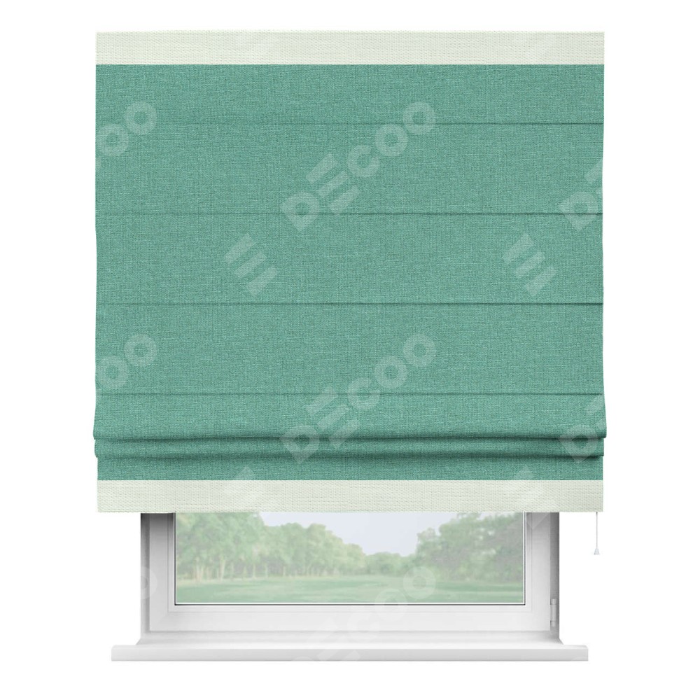 Римская штора производителя «Cortin», используется для проёма, пошита из ткани лён светло-бирюзовый, артикул 53435. Отделка шторы кантом «Горизонт», ткань для канта используется из льна разной расцветки на выбор. Имеет универсальный механизм и подходит для монтажа: на потолок, на стену и в нишу.