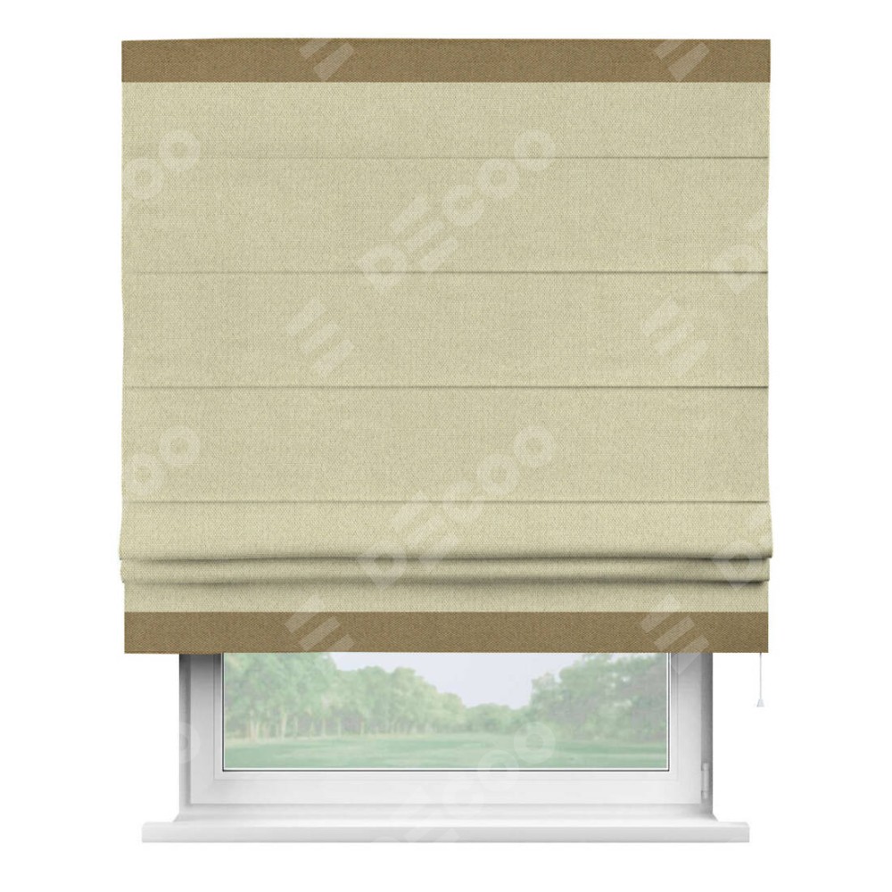 Римская штора производителя «Cortin», используется для проёма, пошита из ткани лён димаут шампань, артикул 90994. Отделка шторы кантом «Горизонт», ткань для канта используется из льна димаут разной расцветки на выбор. Имеет универсальный механизм и подходит для монтажа: на потолок, на стену и в нишу.