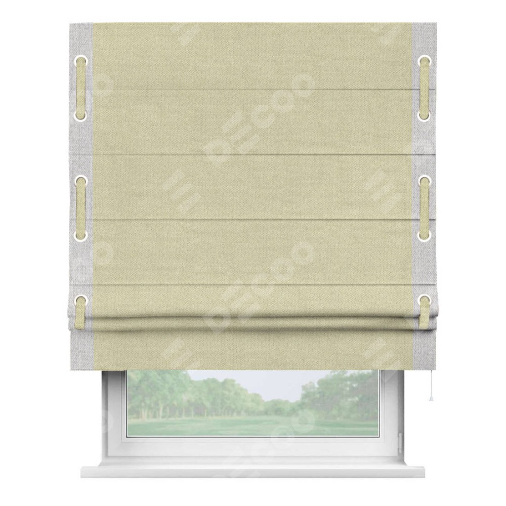 Римская штора производителя «Cortin», используется для проёма, пошита из ткани лён димаут шампань, артикул 90994. Отделка шторы кантом «Стрим Дуо» на кантах расположены люверсы с пояском, ткань для канта используется лён димаут разной расцветки на выбор. Ткань для пояска обычно используется из основной ткани шторы, а так же можно сделать из любой расцветки по желанию. Имеет универсальный механизм и подходит для монтажа: на потолок, на стену и в нишу.