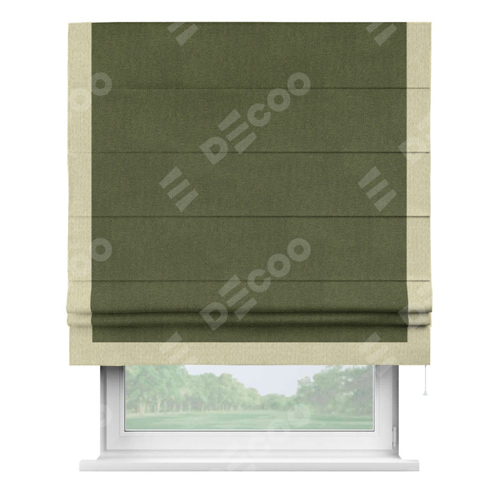 Римская штора производителя «Cortin», используется для проёма, пошита из ткани лён димаут салатовый, артикул 91002. Отделка шторы кантом «Виктория», ткань для канта используется из льна димаут разной расцветки на выбор. Имеет универсальный механизм и подходит для монтажа: на потолок, на стену и в нишу.